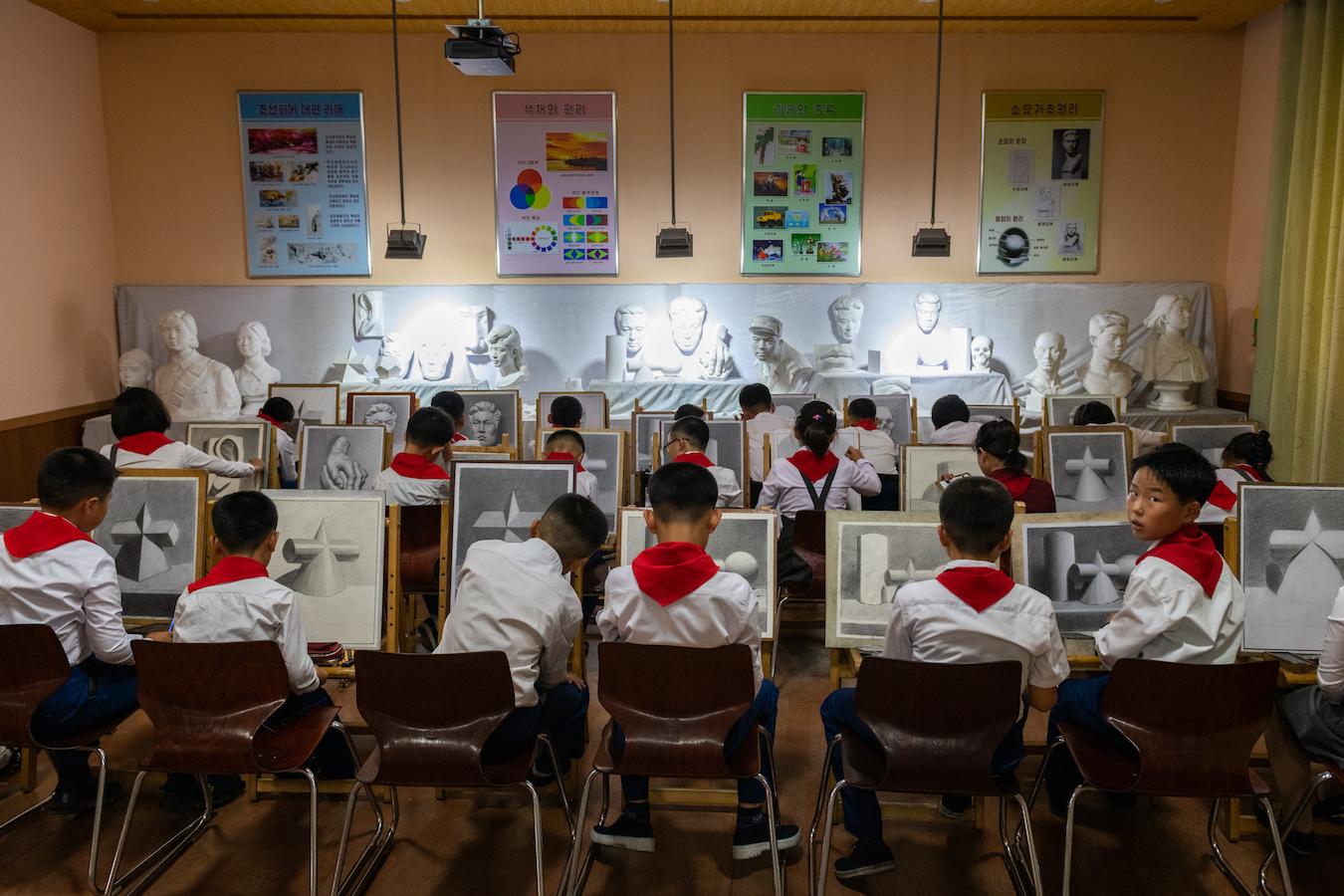 While the main purpose of the trip was to photograph the games, Lau also wanted to show something of daily life in North Korea. Elsewhere in the book, there are photographs of the Pyongyang Subway, which was inspired by those in Soviet Moscow and decorated in sky blues and baby pinks.
