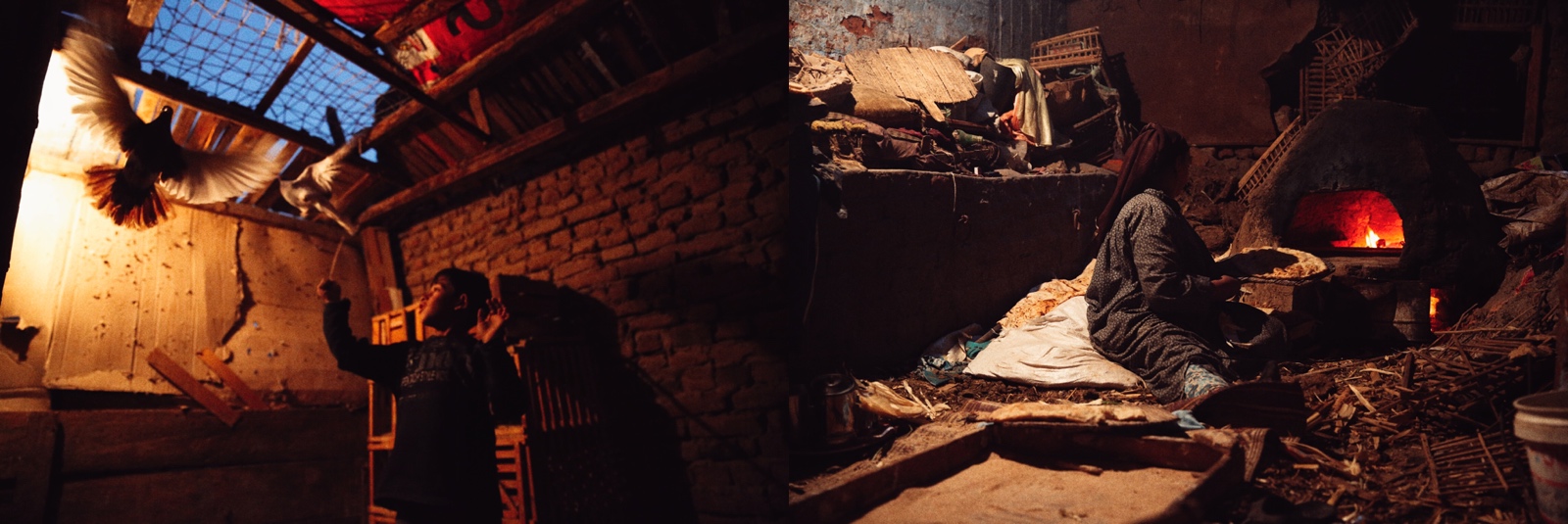 Arabic literature is very poetic and full of beautiful metaphors. I tried to depict the emotional metaphors in the poem which are full of pain and longing through two photographs: the sorrow of a lonely mother doing her duties – baking bread for her family while staring at the fire and lost in thought -, and a dream-like photograph of a young boy playing with pigeons which represents peace and love. I merged the two photographs together to evoke the idea of her longing to see her son and feel his presence. The wind is bringing him to her mind. Two worlds flow and become one. Separated yet connected.