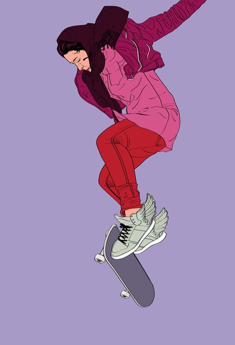 When I read the poem for the first time, an image of Muslim girl skating high in the sky came immediately to mind. In most of my works I turn photographs into drawings to create new imaginary about women from a feminist perspective. This drawing was inspired by an image by Massoud Hossaini depicting Afghan girls skating in Kabul in 2013. There is a defiance in showing Afghan girls feeling free and liberated. I created the sky as a background and the “wing shoes” to emphasise the idea of freedom.