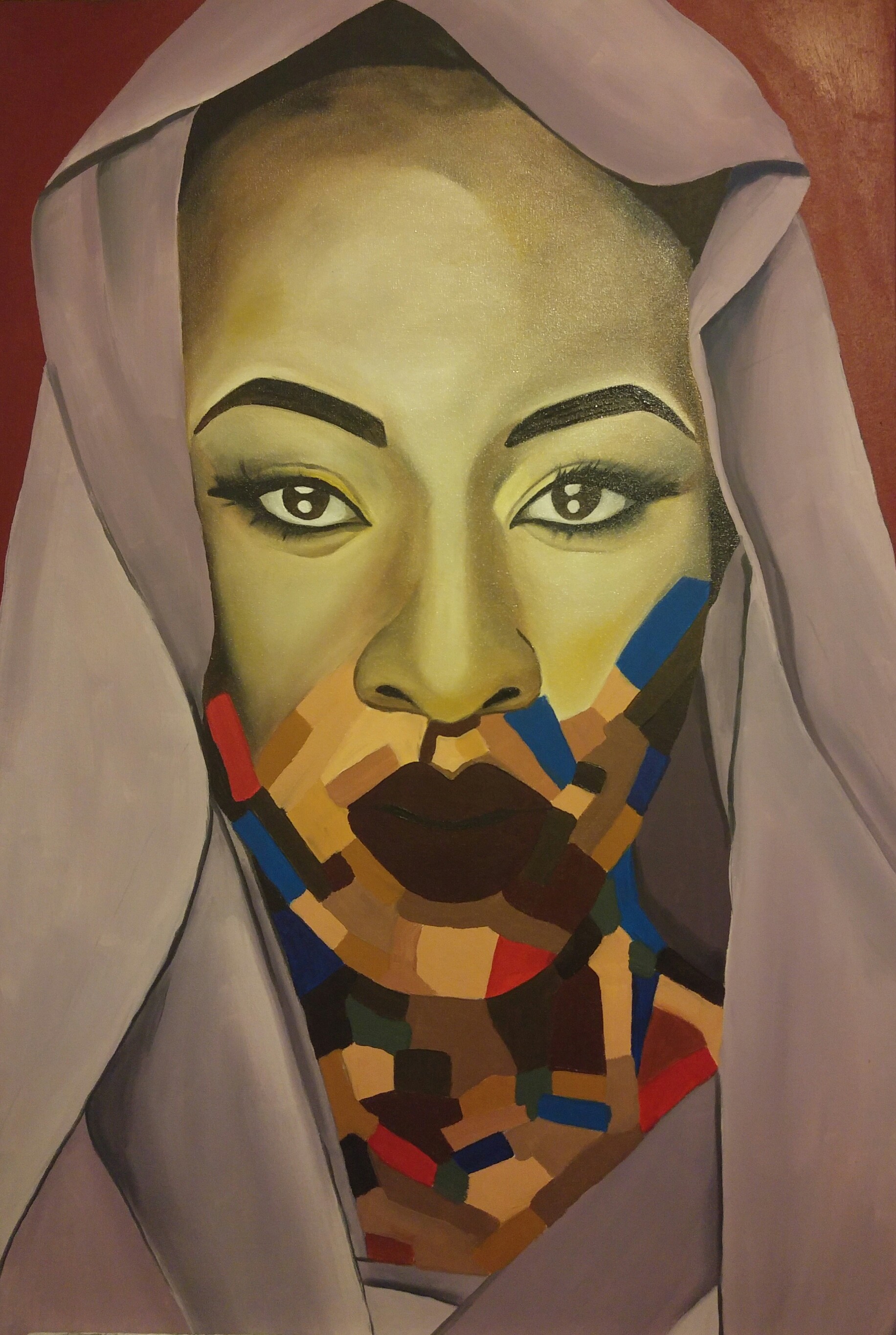 What’s important for me is to have different psychological layers appear in the artwork. Things happened like: the lips are smeared. And it makes her look really messy, like maybe she’s been tussling in the bedroom all night. And she might also look a little hurt. You could interpret the blue eyes as black eyes. I liked that the painting is a little messy and complicated.