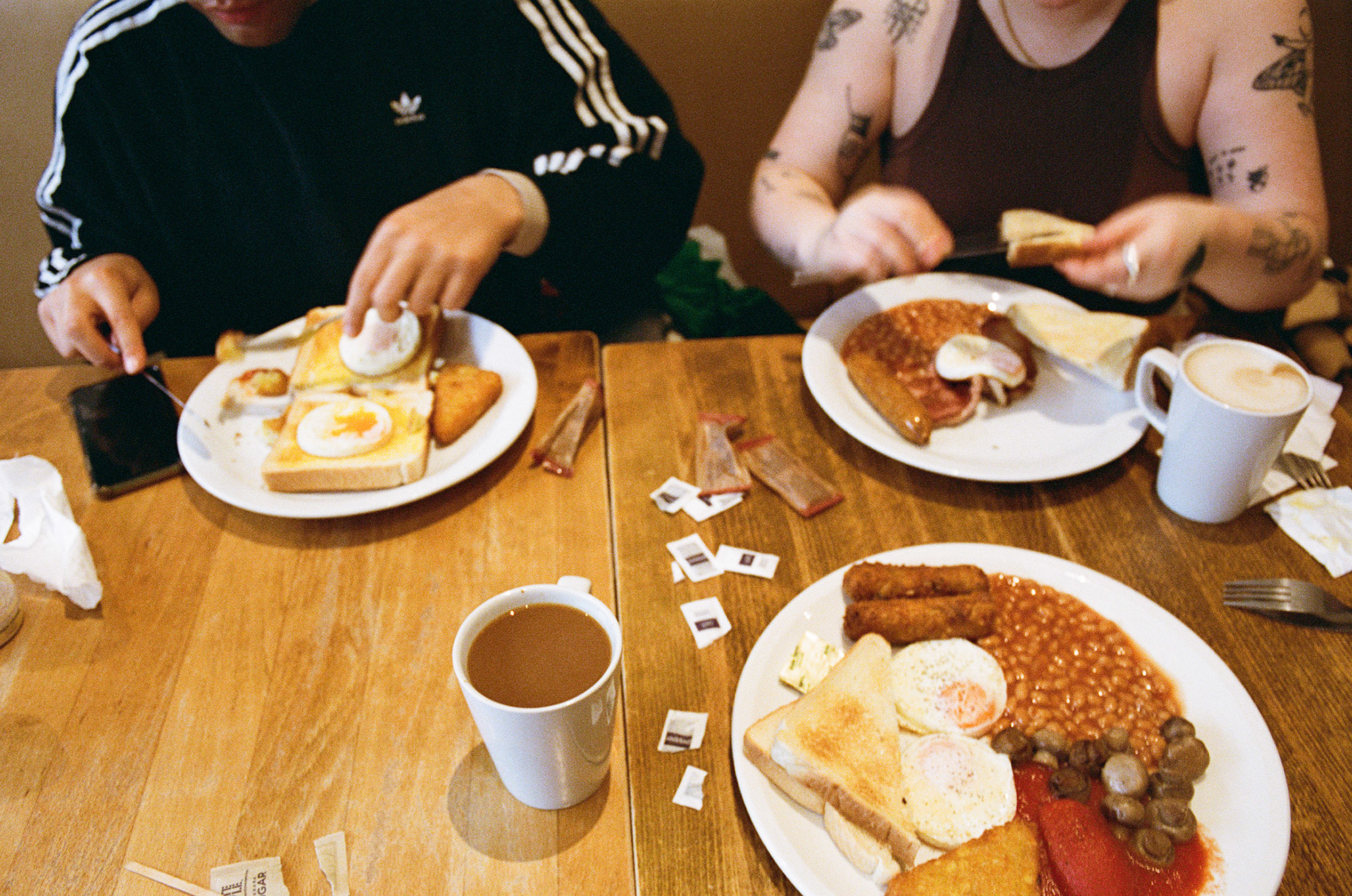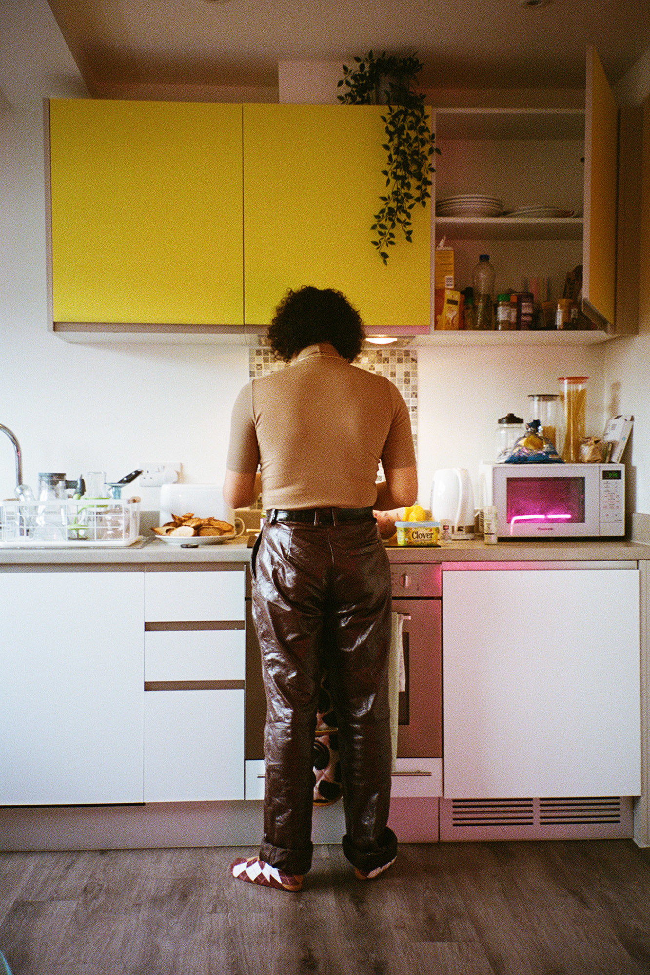 That picture now forms part of their new exhibition, a girl for the living room, which is currently running at The Martin Parr Foundation in Bristol. Alongside that photograph is a series of intimate portraits and candid shots of Travis living their daily life, made over the last 12 months. From eating a fry up with all the trimmings to cleaning up their kitchen and hanging with friends in a studio, the photographs give a peek behind the curtain into Travis’s domestic day-to-day, while simultaneously showcasing their full-throttle, authentic expression of self away from the performing stage, the online eye, and the dancefloor.
