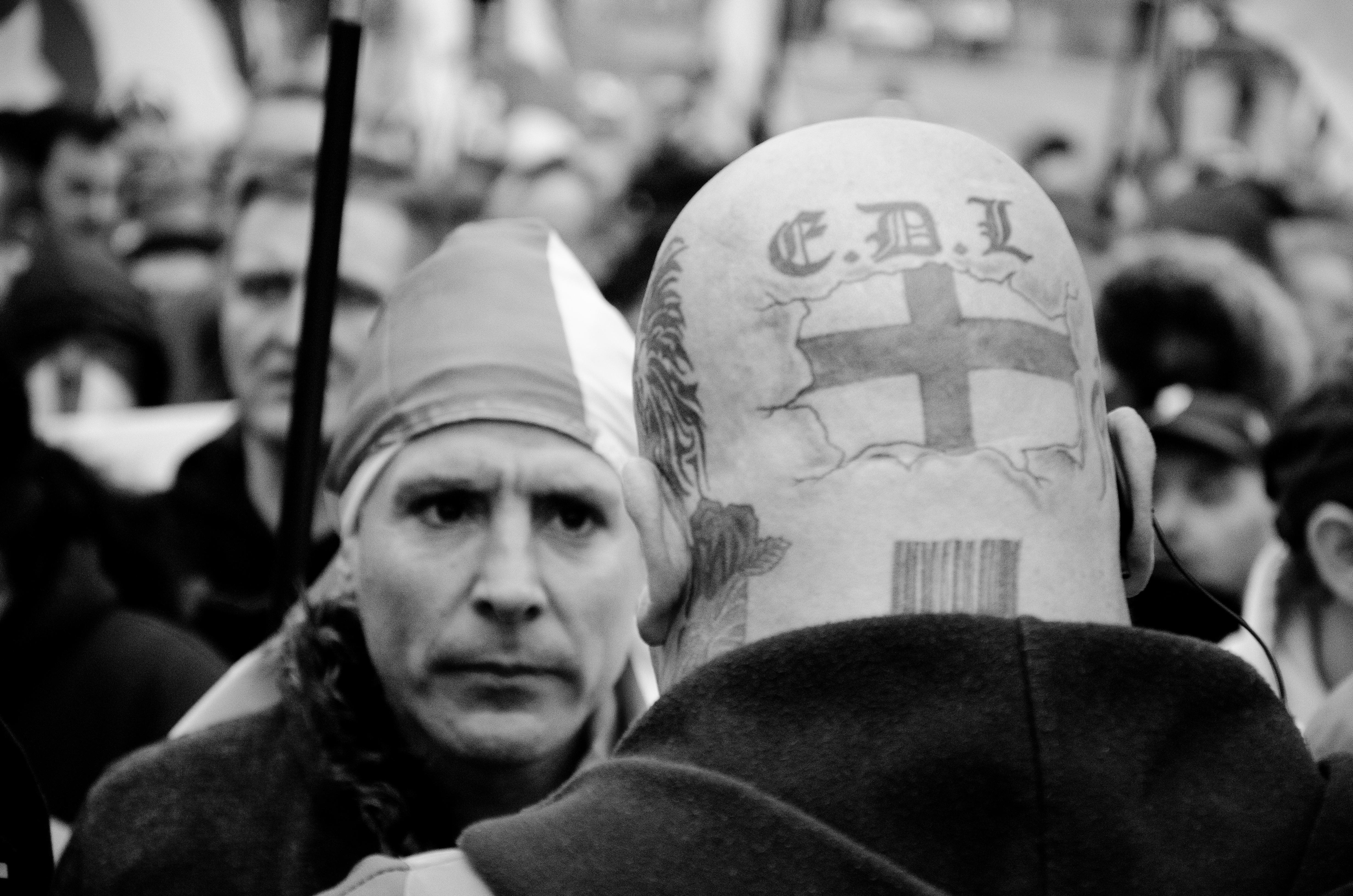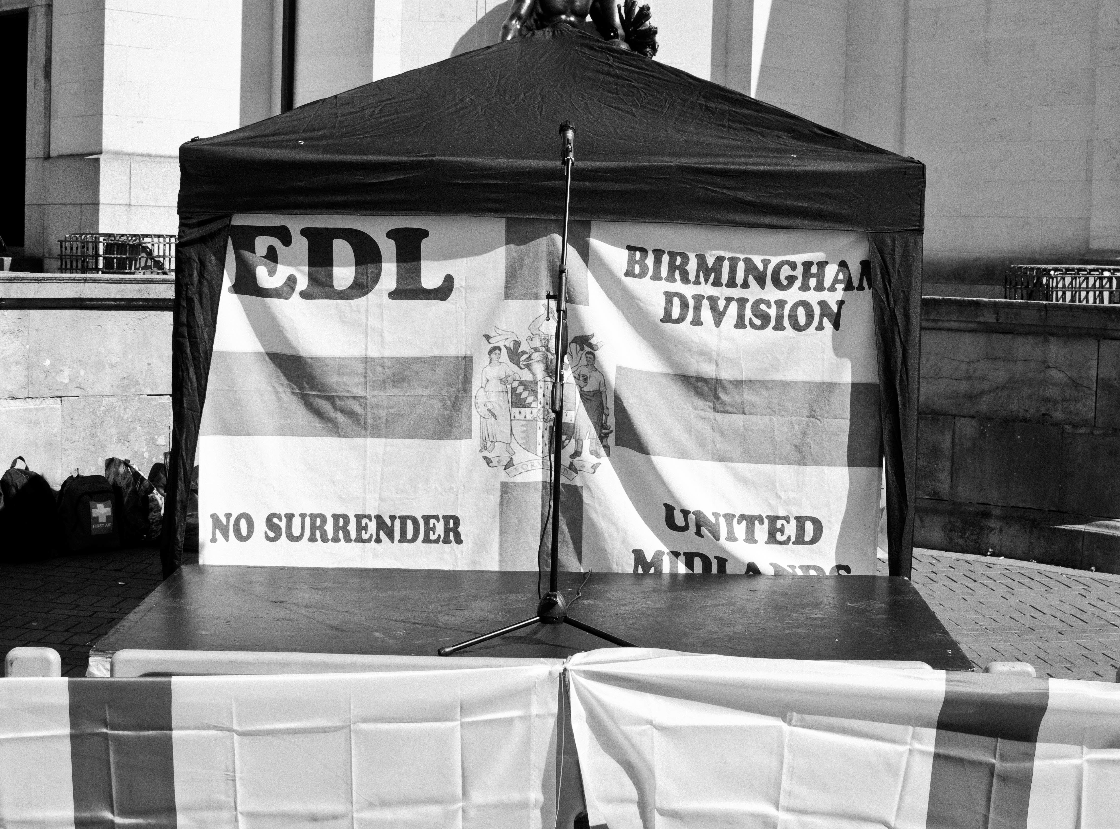 Ali, who taught himself how to take photos after failing a photography course at university, hoped to represent the essence and the mood of these demonstrations, and was always looking for things that other people missed. While other photographers focused on people, he tried more ambiguous shots, snapping haunting images of an empty podium, a lone EDL flag flapping in the wind, and close-ups of tattoos on shaved heads. It wasn’t clinical documentation; Ali was not afforded the luxury of being a neutral observer. “The other photographers were white. The [demonstrators] weren’t reacting to them, they were targeting me,” he recalls. The reaction kept him coming back. “It was like my own protest,” he says. “I wanted them to see me, to know I was a Pakistani Muslim and I would keep turning up. I remember hearing them chanting from far off […] it used to give me a buzz. I loved it, I won’t lie.”