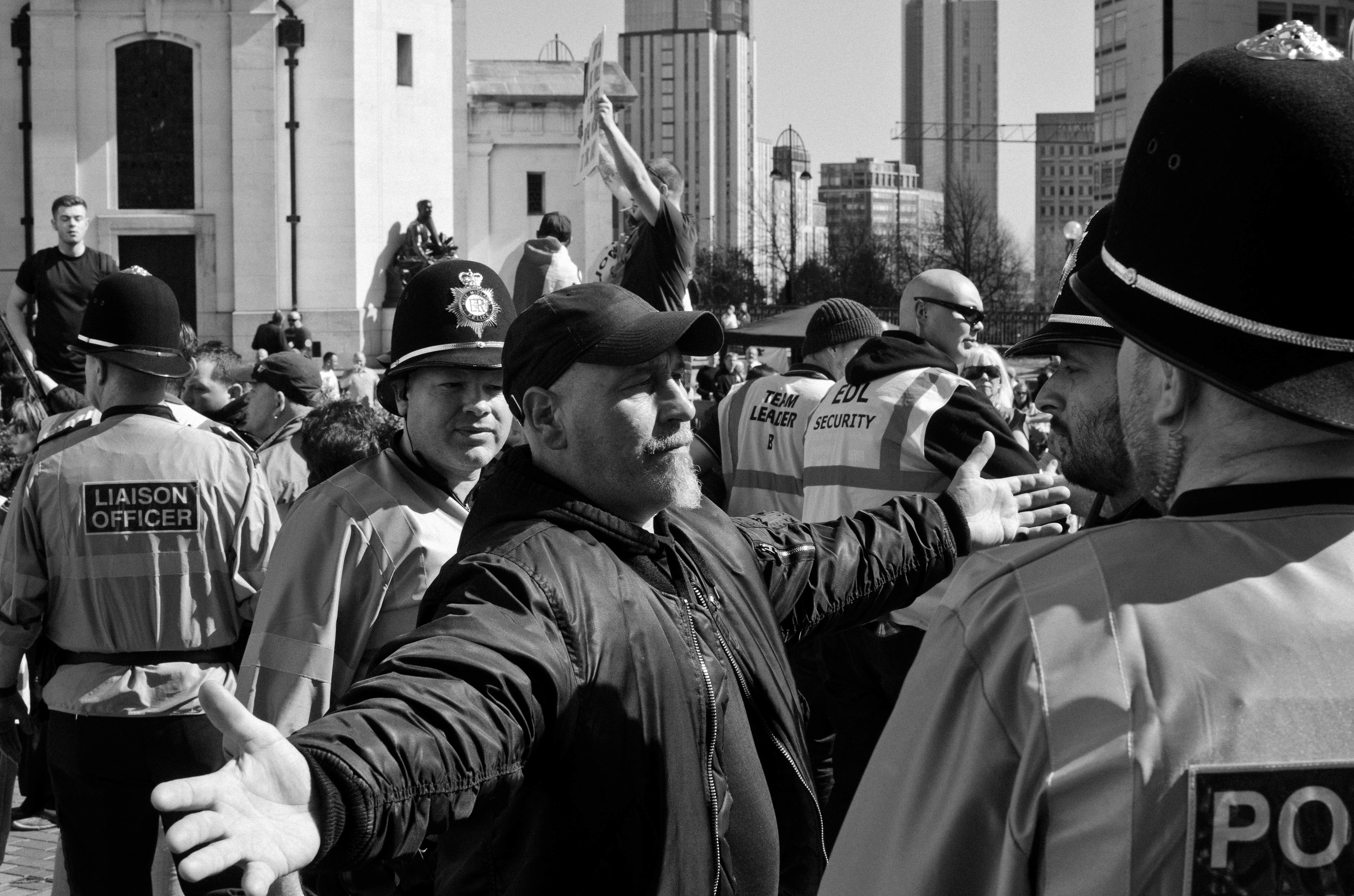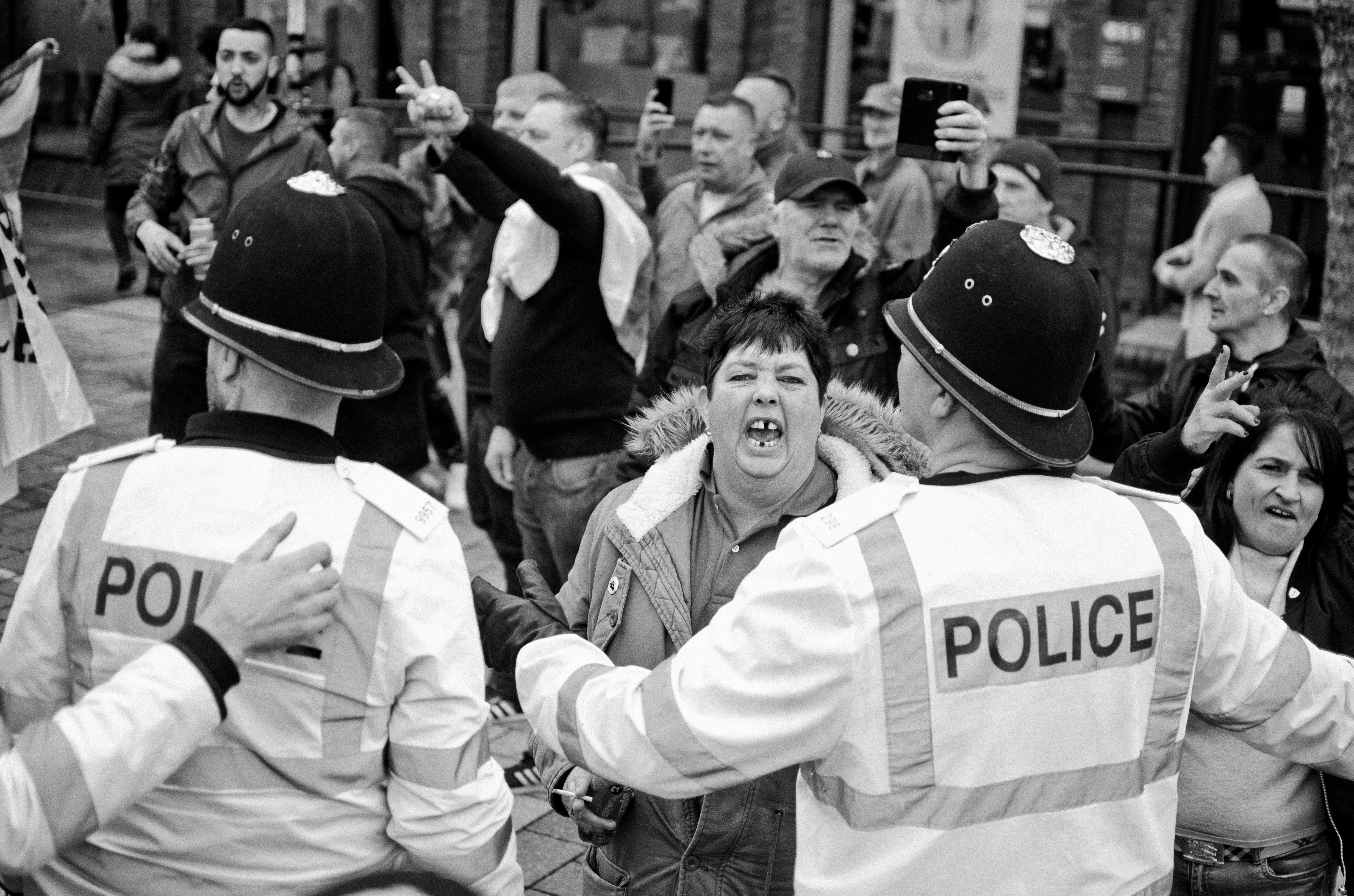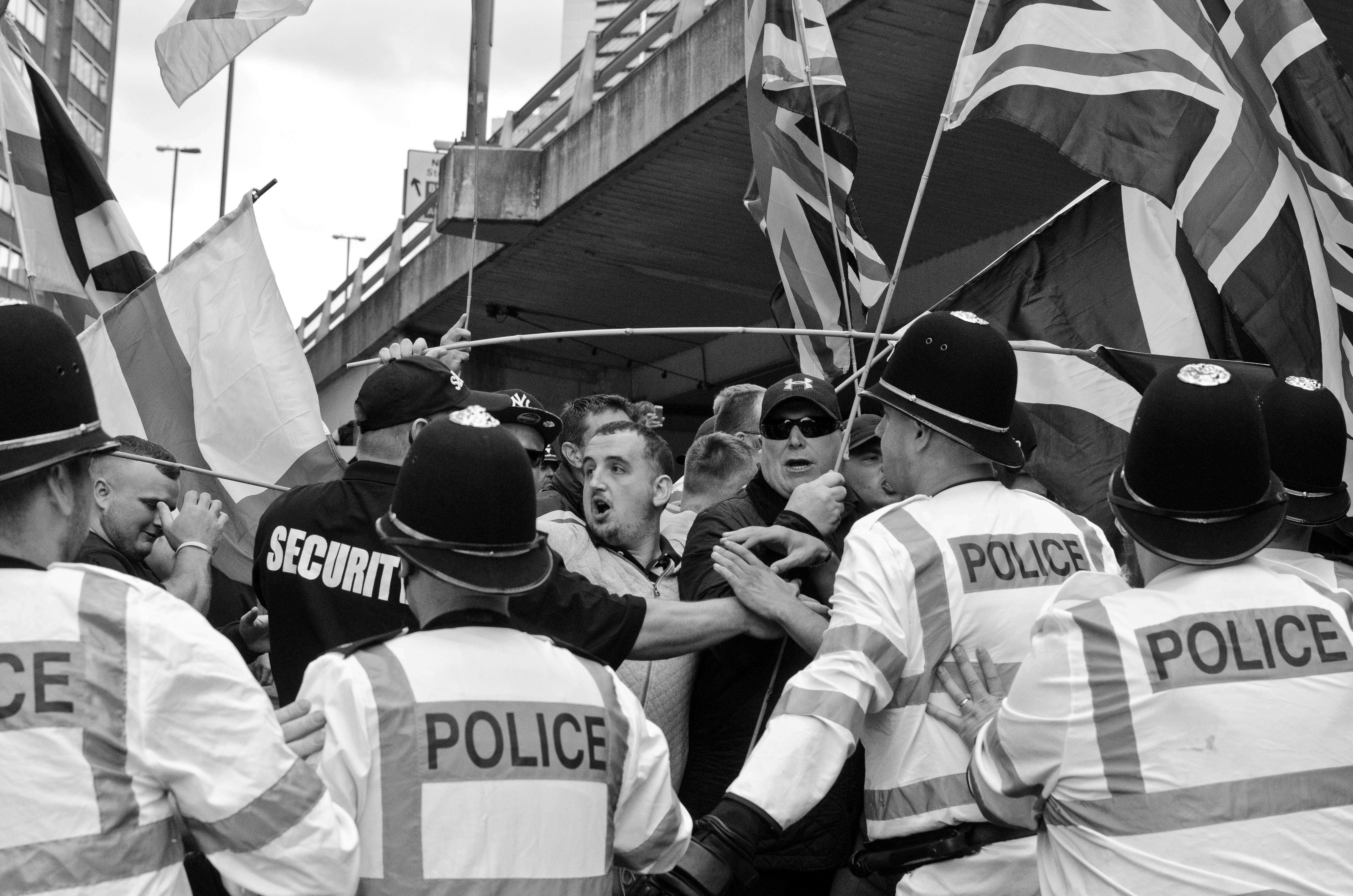 Among the sea of white faces, Ali – as a tall brown man – was easy to spot. Not least because he was standing, Nikon D700 in hand, on the steps of Dudley Council House while Britain First’s then-deputy leader Jayda Fransen delivered an anti-Muslim speech a few metres away. She was interrupted by Paul Golding ordering his “henchmen” to remove Ali; a video posted by IAmBirmingham shows him being dragged over a handrail and frog-marched away to chants of “pedo” from the baying crowd.