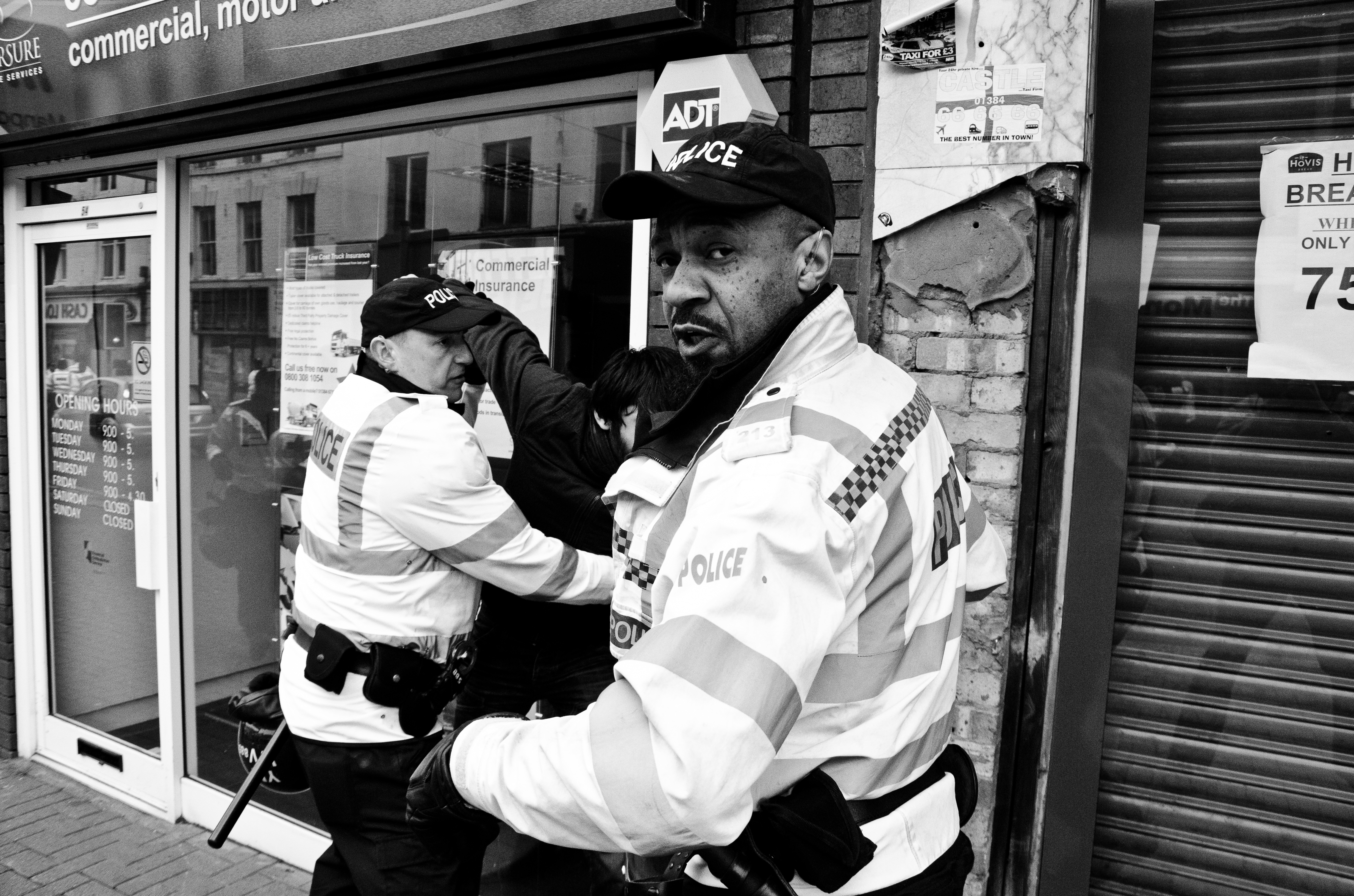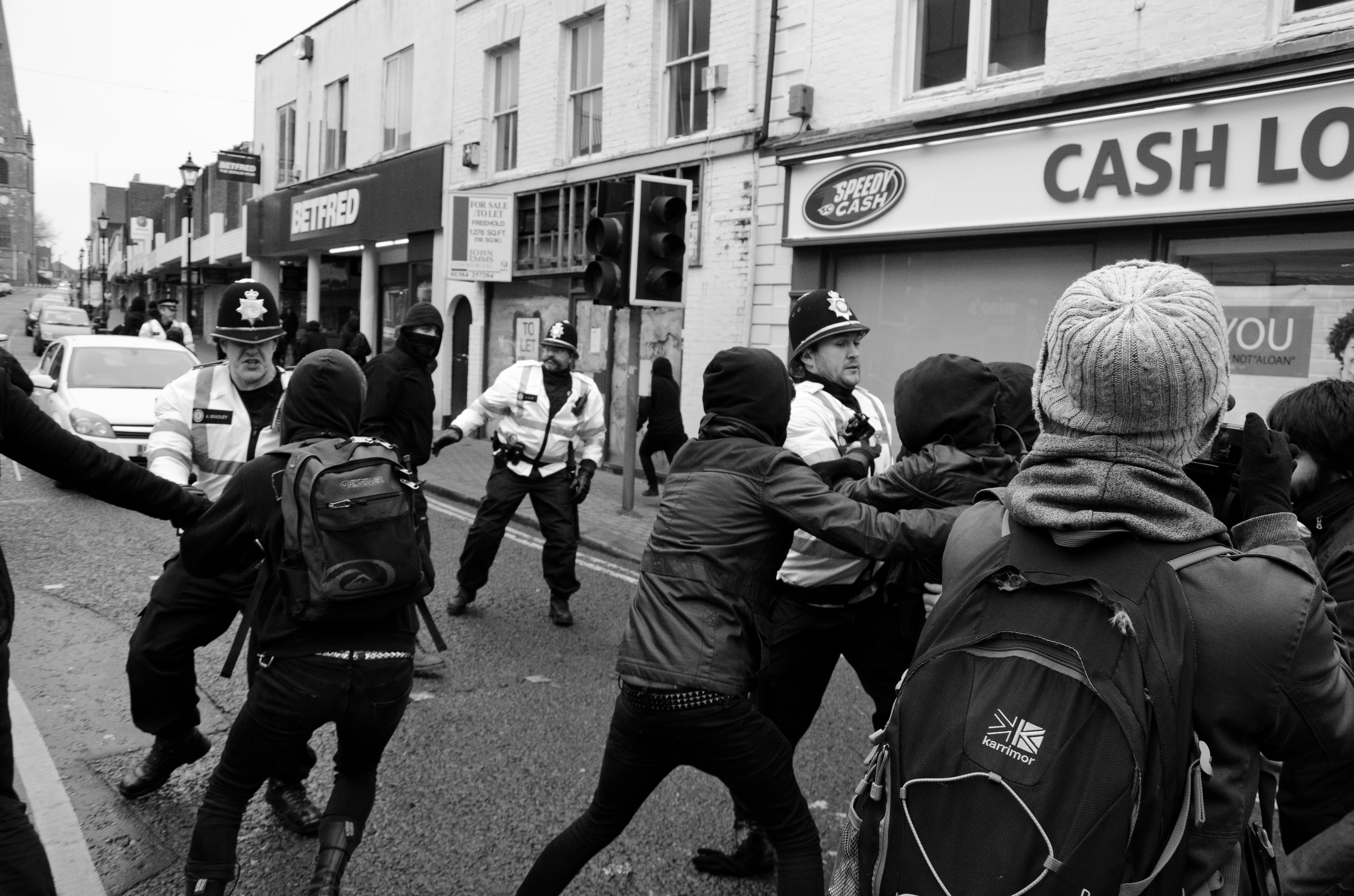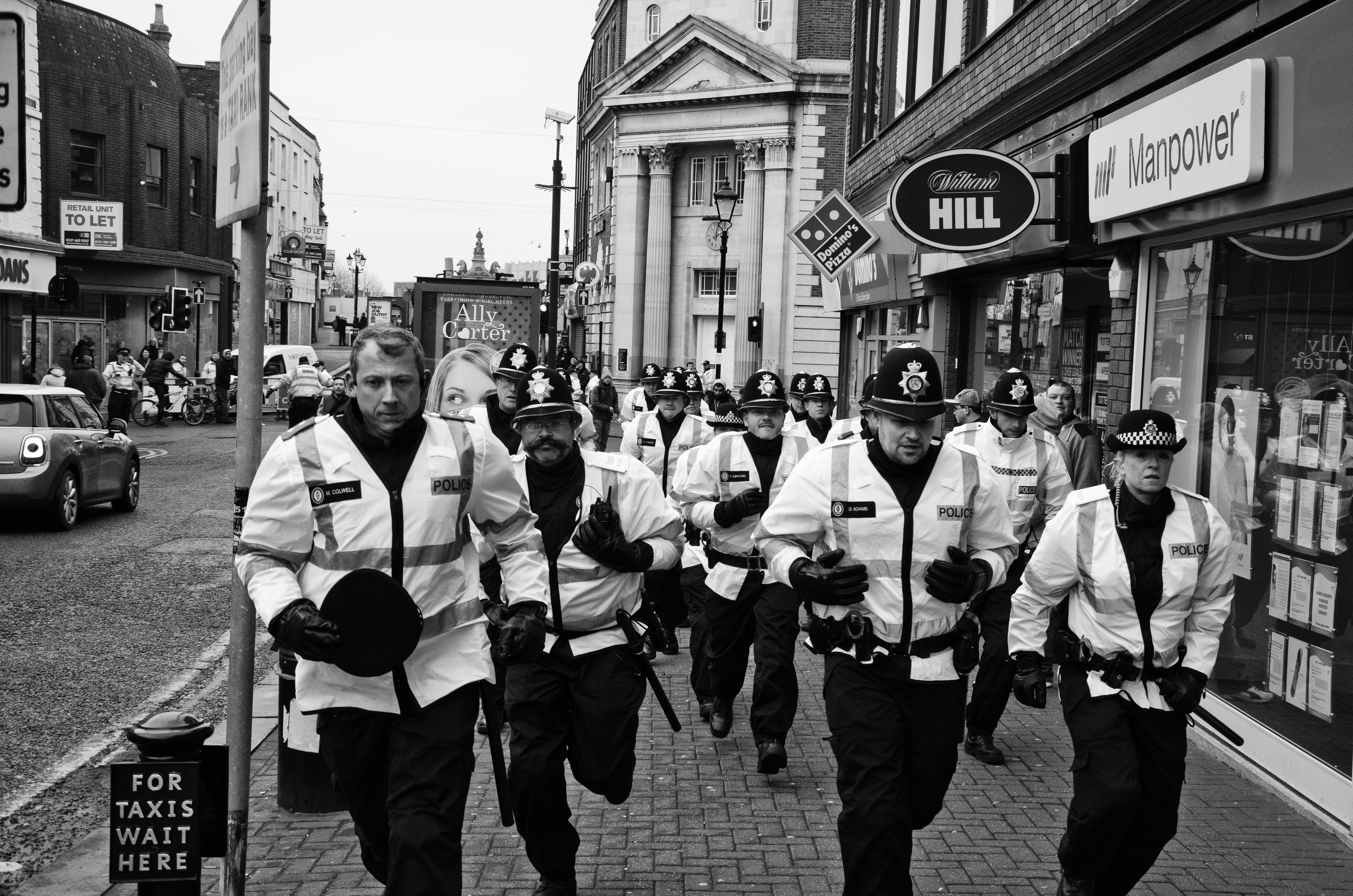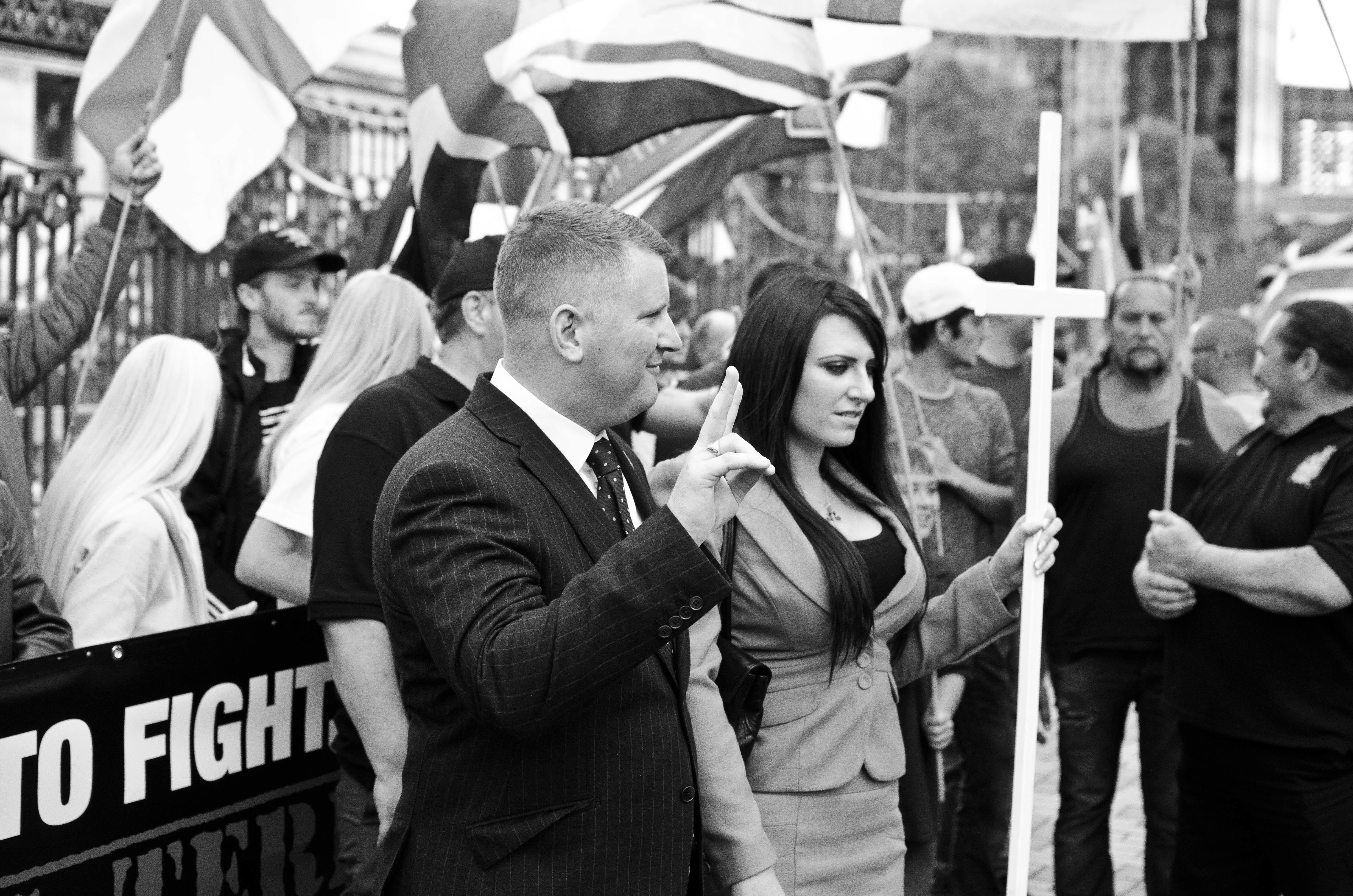 Among the sea of white faces, Ali – as a tall brown man – was easy to spot. Not least because he was standing, Nikon D700 in hand, on the steps of Dudley Council House while Britain First’s then-deputy leader Jayda Fransen delivered an anti-Muslim speech a few metres away. She was interrupted by Paul Golding ordering his “henchmen” to remove Ali; a video posted by IAmBirmingham shows him being dragged over a handrail and frog-marched away to chants of “pedo” from the baying crowd.