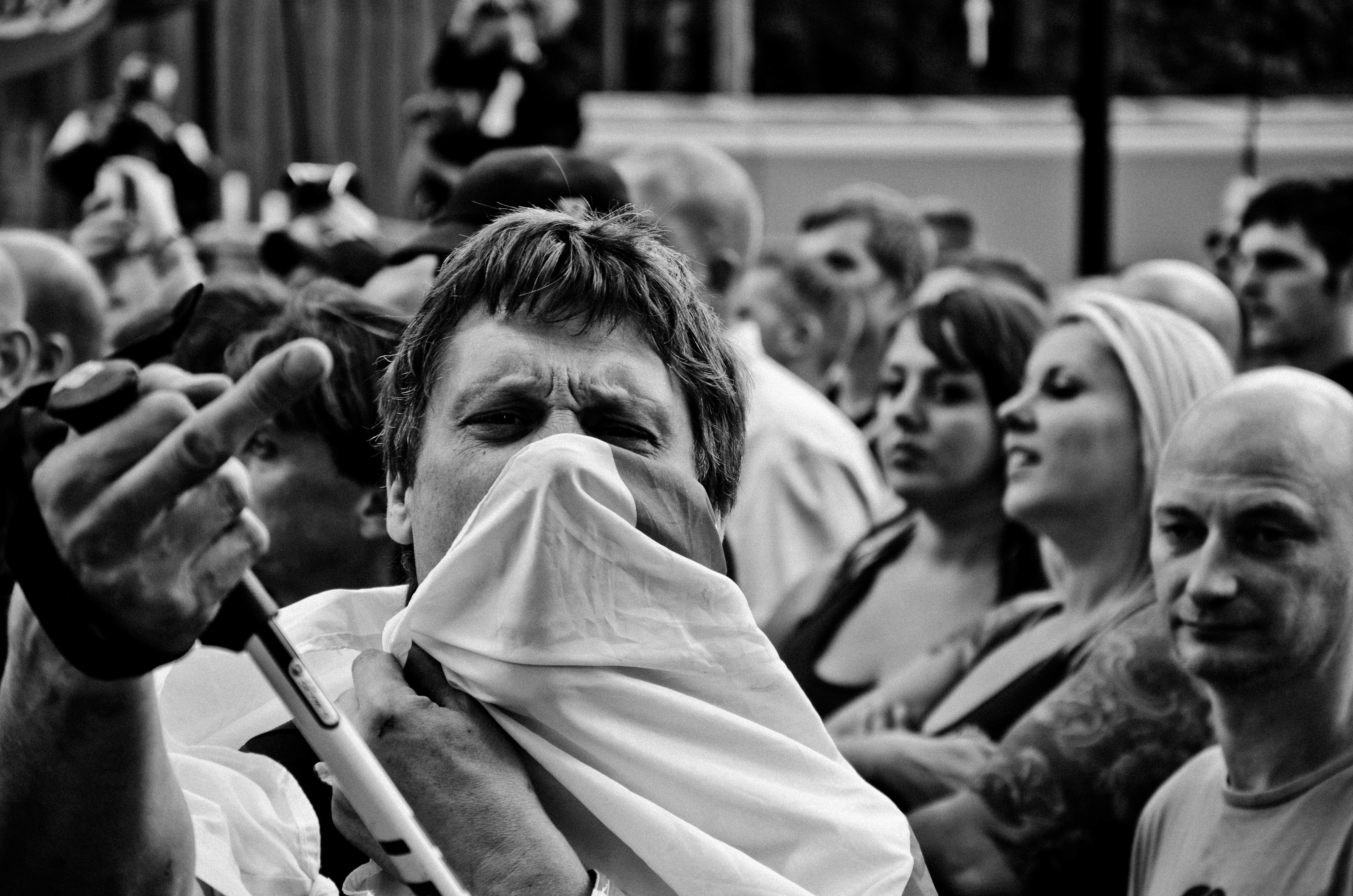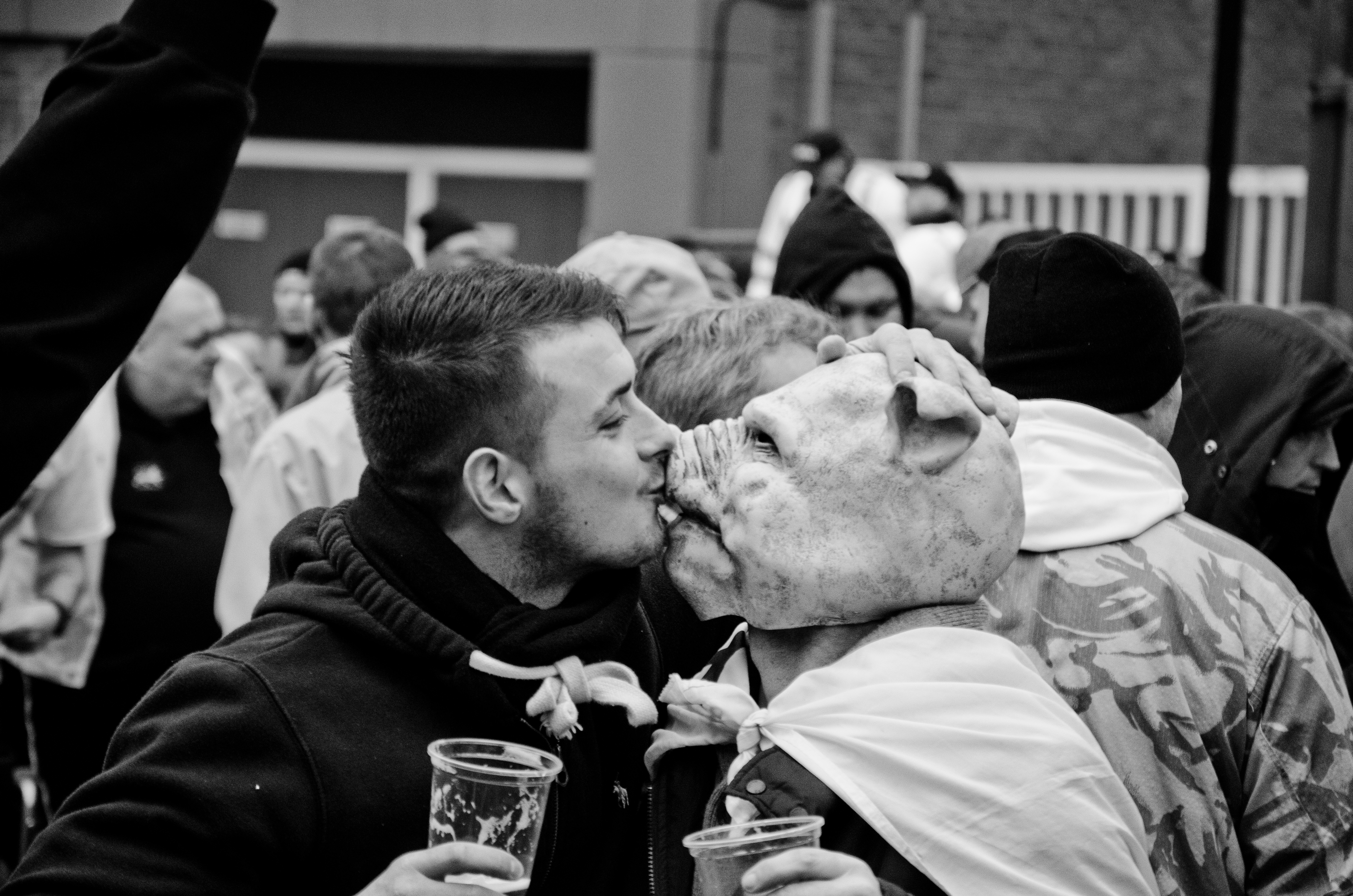 After that, something clicked. “I realised I had to step up. I thought, ‘You are a Muslim, a second-generation immigrant, this is directed at you’,” he remembers. He’d be at a demo week in, week out, reacting to violence by clicking the shutter button on his camera. He was unfazed, and often bemused, by the constant threats. These moments of provocation make for some of his most impactful photographs, with angry faces and middle fingers seen in suffocating proximity. During that EDL demo in Dudley in 2015, one demonstrator kissed another wearing a pig mask.“They were shouting ‘Muslims watch this’ an ‘Ooo good old bacon’. I just started laughing. They think Muslims will see a pig and melt,” Ali says.