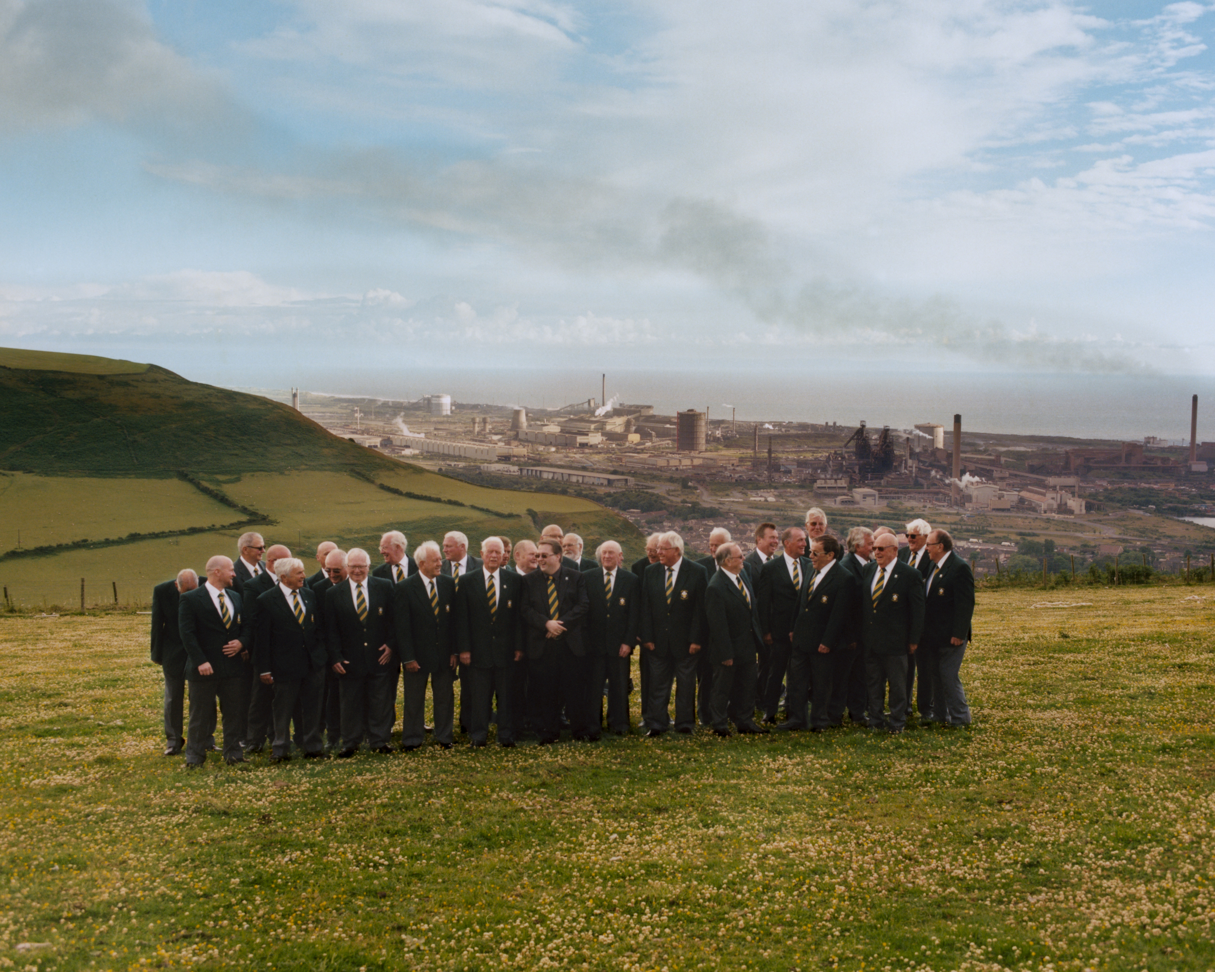 Lewis tells about his first meeting with the choir. He drove to the church and parked at the top of the hill, with the town spread out below him. “You could hear the sound of the steelworks — the hissing and the sound of industry. It’s quite relaxing actually, it’s like chugging along. It reminded me of my grandad’s boatyard.” As he walked towards the church, the sound of singing rose through the noise of industry, until he was inside the church, surrounded by men, all in song. “It was really emotional. I haven’t experienced anything like that in England. These are like steelworkers and rugby players and that sort of old school masculinity – you know, the lads – and they might come in their vans or whatever, but they’re singing in a choir.”
