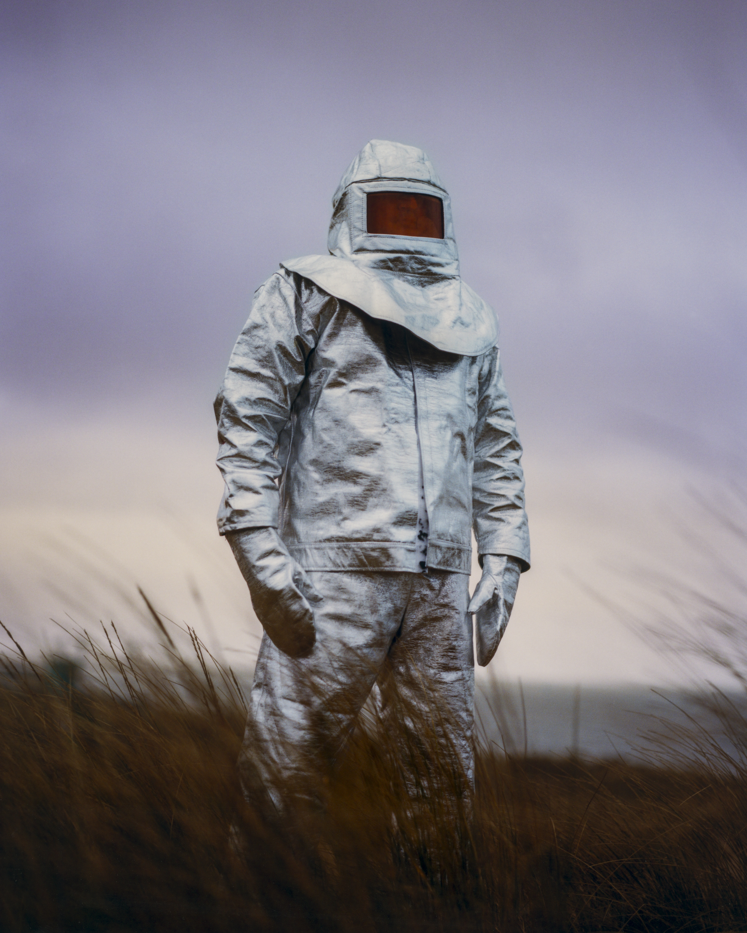 “Late summer, 1988. A small, bright light moves slowly over the mountain towards the coast, it stops over the steelworks for a few seconds then, flash, it shoots off towards Swansea. I had always had a fascination regarding UFOs and this only made my belief stronger.” Photo: Jonny Lovejet in the dunes wearing a thermal radiation suit similar to that used in the steelworks. This was shot when some Saharan dust clouds hit the UK giving the sky this wild orangeade pink.