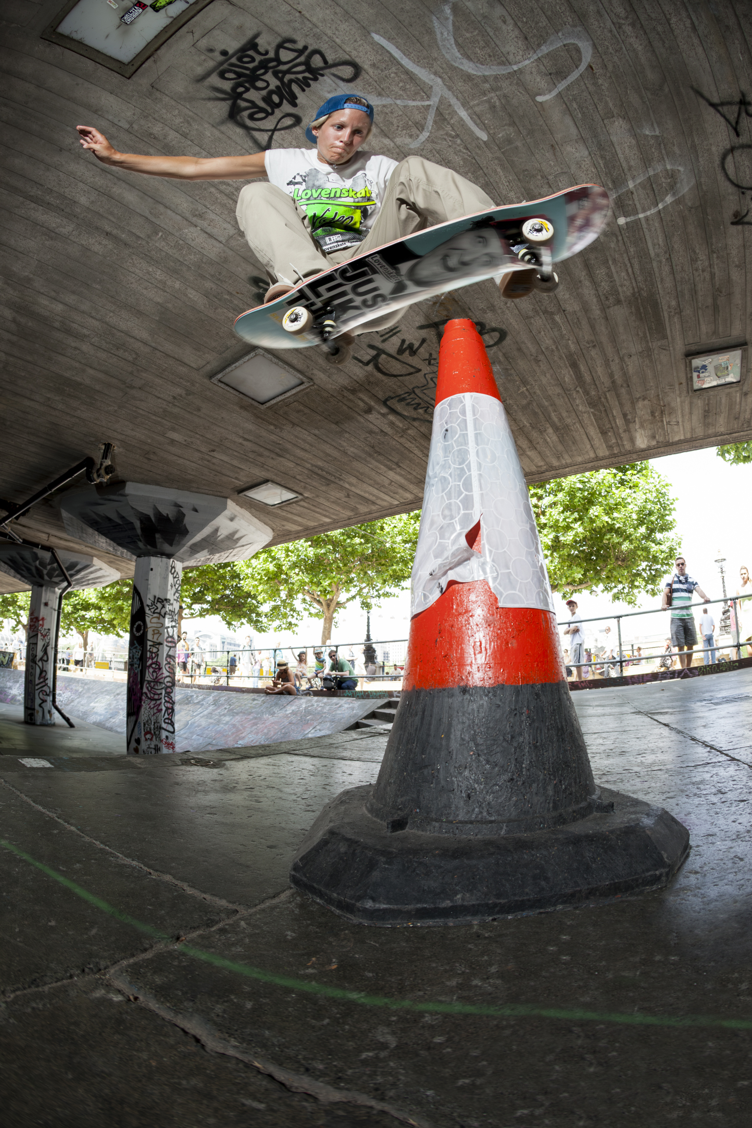 They’ve filmed at the Undercroft enough times to know its quirks intimately. The light reflecting off the river shifts constantly, making certain angles a nightmare unless you want a skater silhouetted. And then there’s the corner. “It sometimes smells of piss,” she says. “It’s not glamorous, but it’s part of the reality of the space and somehow adds to that raw, unfiltered feeling of Southbank – even if we would prefer guys stopped peeing there.”