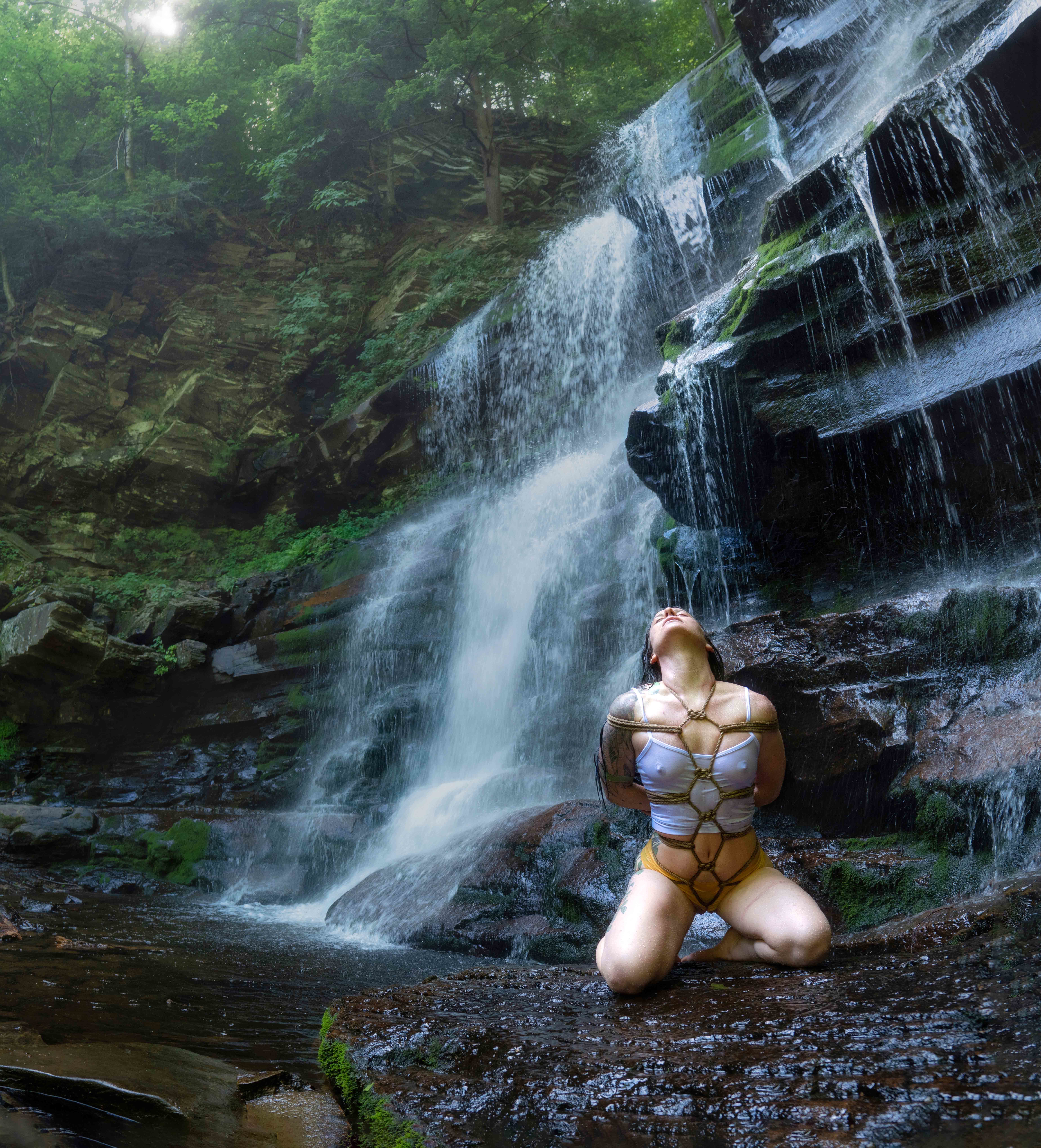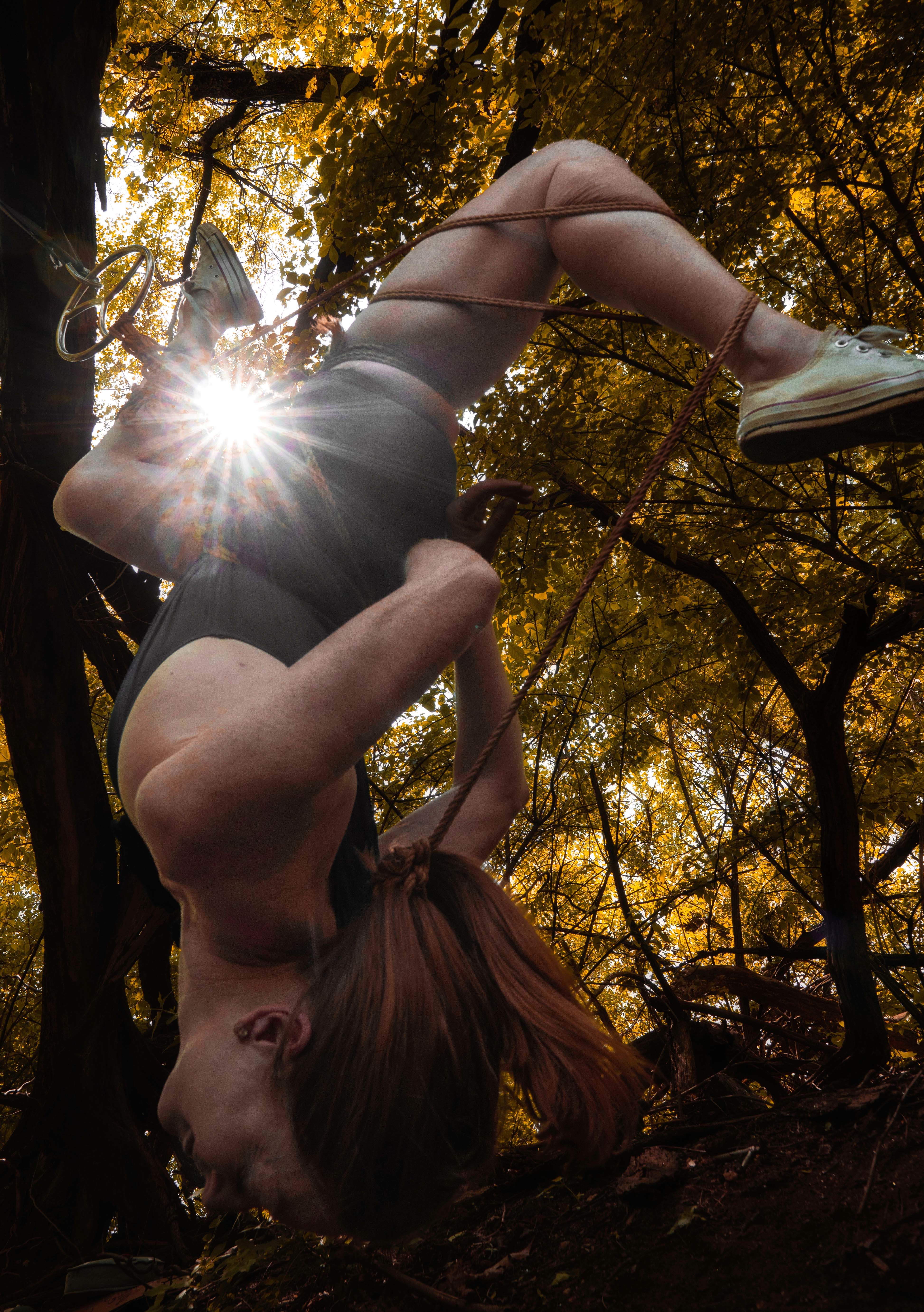 After walking for a while, the paid came to a small clearing where they decided to stop. With an intricate network of ropes and carabiners, Red began to tie herself to a nearby tree until she was suspend upside down, with just the rope and the strength in her spine preventing her from toppling onto the forest floor. With the golden-hour sun streaming in between her thighs, Cohen angled his camera and flicked its shutter.