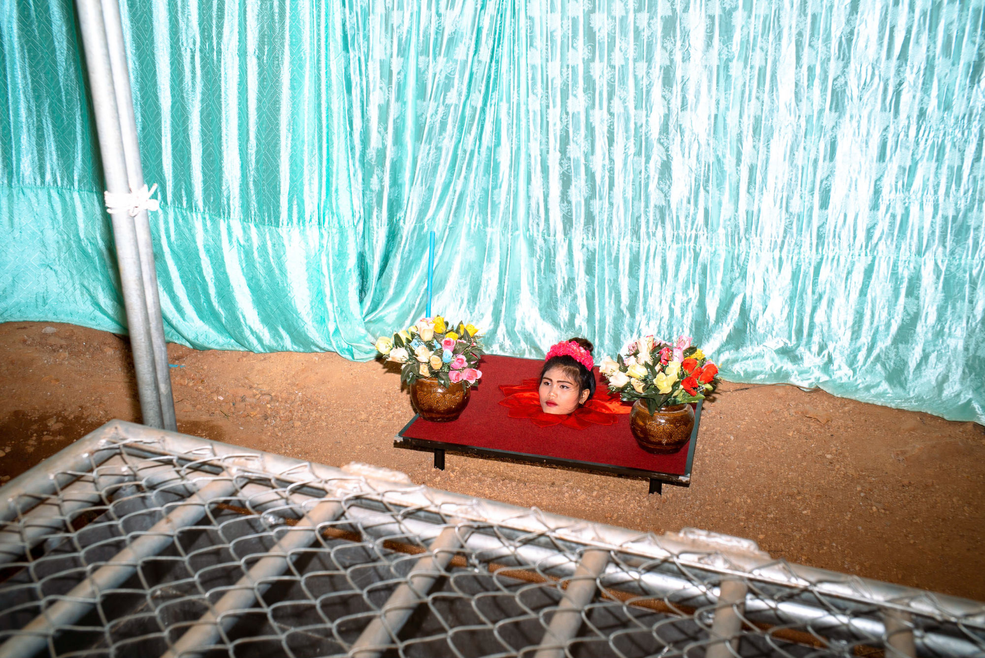 His photographs are an ode to the magic of everyday life in regional Thailand. Brimming with humour, colour and a vividness that transcends the daily grind, Sikitikul is always on the lookout for the extraordinary within the mundane. Whether it is a pair of inflated dinosaurs hitching a ride on the back of a security cart, or a pair of legs dangling from an invisible platform, his pictures are surreal to the point that almost all of them require a double take.