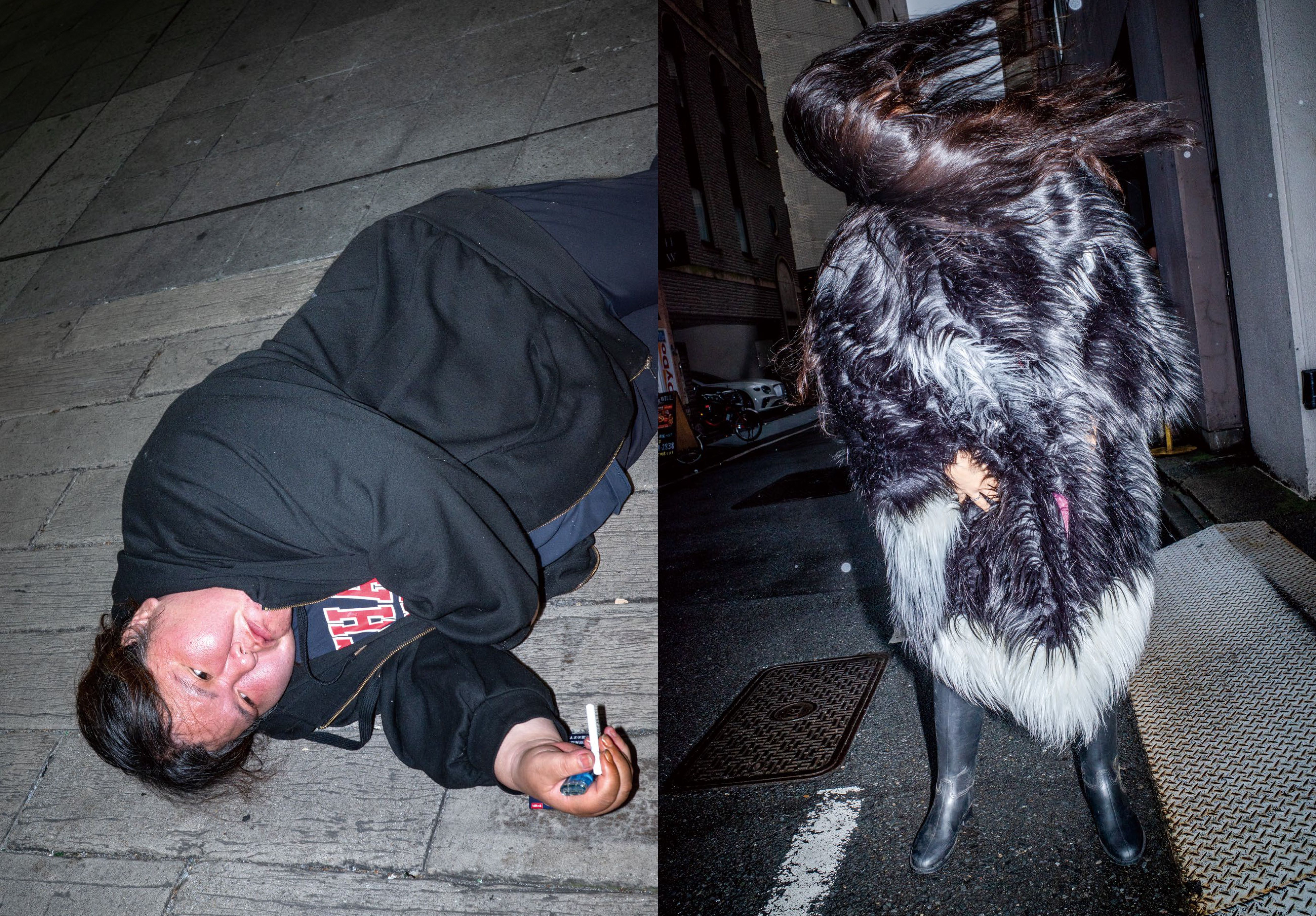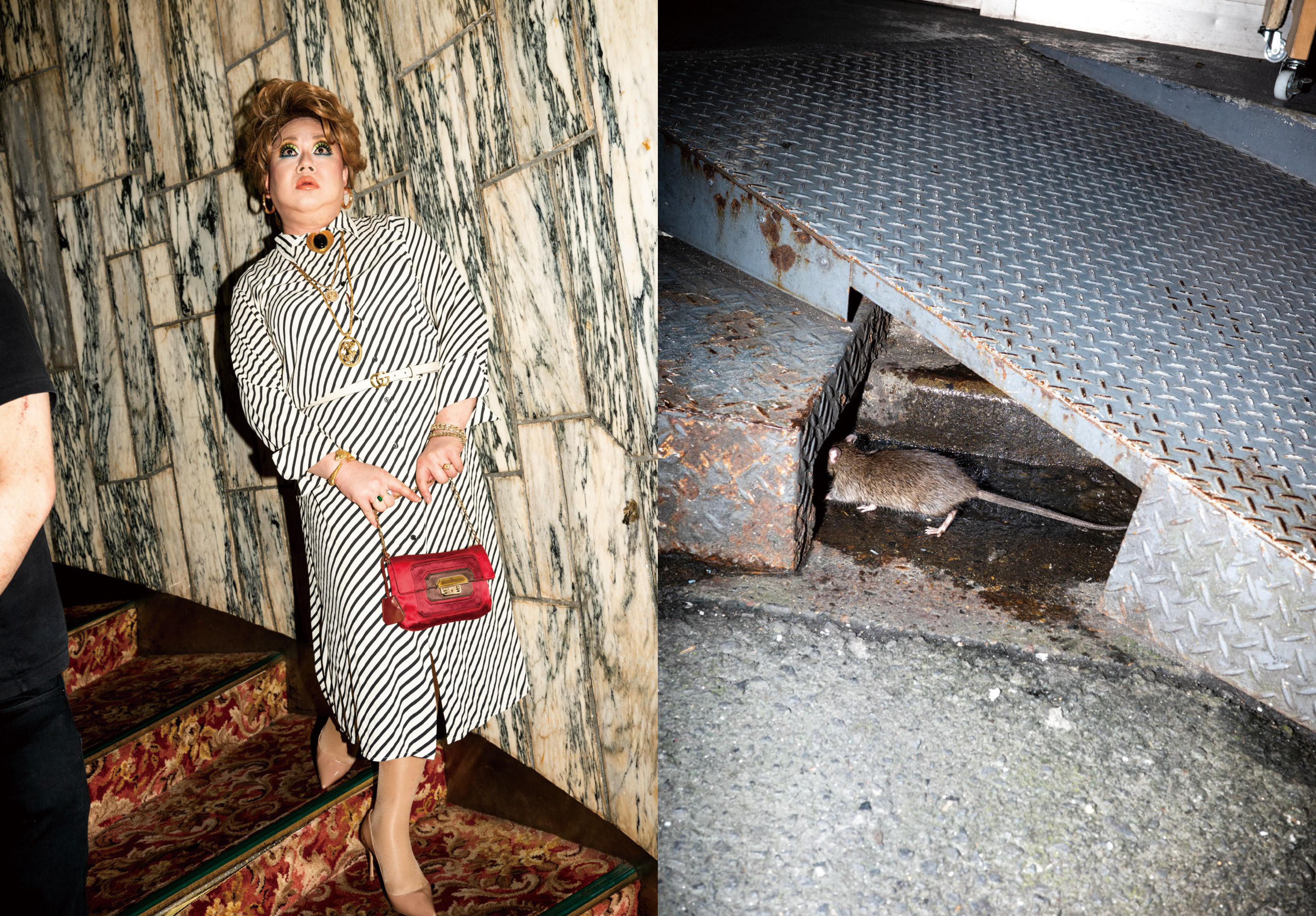 Bright, characterful outfits are on display throughout the book, while a tension lies underneath the surface, whether it’s a picture of a rat climbing into a drain, or a snake climbing up an umbrella. “My favourite is the Shinjuku area, where there is always so many people,” Feng says. “I love standing at the intersection and watching crowds pour in like a tidal wave, especially on weekends when everyone seems to stay out all night. I think the city is fascinating because it is a complex [web] of contradictions, cultural [amalgamation], conflict, relationships between people, and so on.”