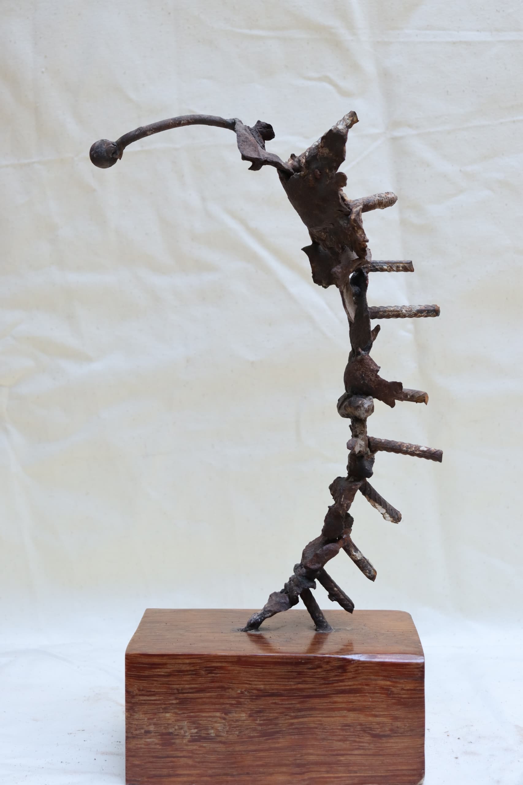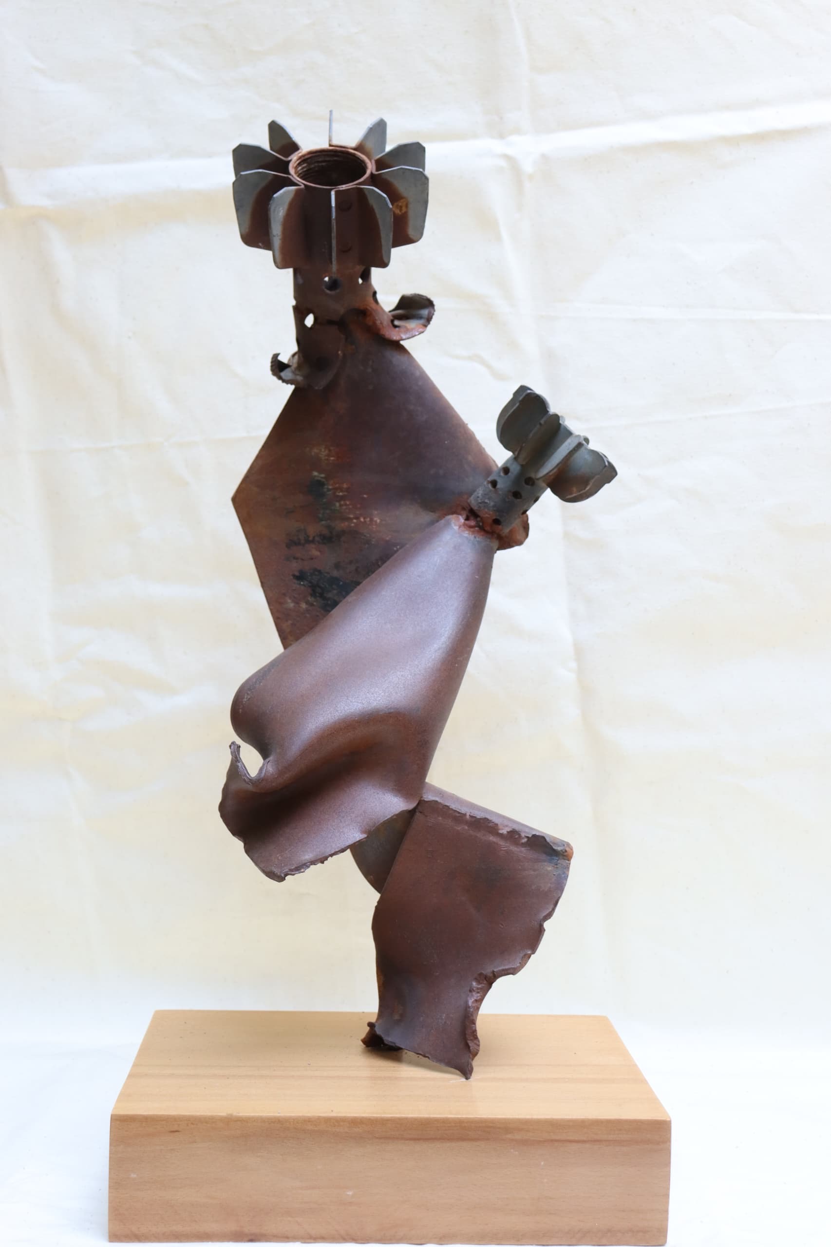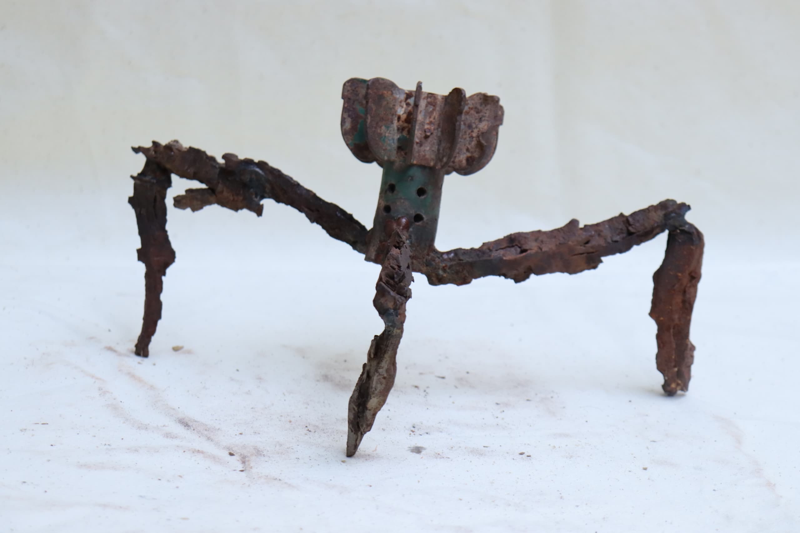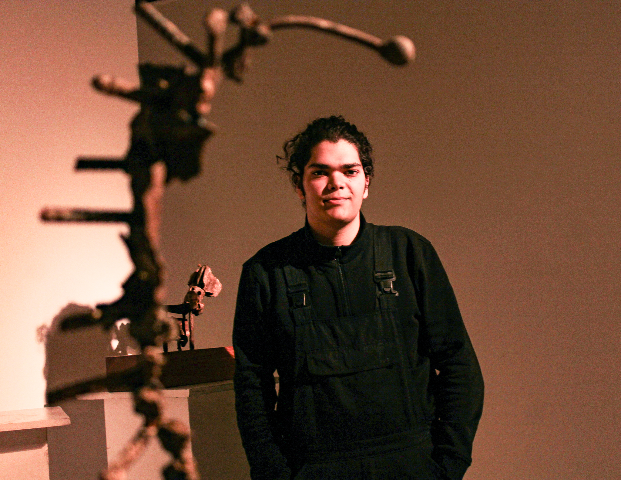 He shows me his collection of war remnants at his home in eastern Damascus, opening a big metal box filled with bomb parts and scrap metal. It is a treasure trove of menacing finds – including the nose of a huge cluster bomb. He searches for the fragments when he goes on walks with his dad in areas where there were lots of bombing, like Jobar and Yarmouk in the suburbs, as well as Zabadani, a town in the south. First, he checks to see if they are safe and empty, researching what they are if he is unsure, then he puts them in his backpack and takes them home to start designing the sculptures, before taking them to be welded. He says he is inspired by his dreams and the shapes of destroyed architecture, which he finds beauty in. “Sometimes I think it looks like the bombed buildings are hugging each other,” he says.