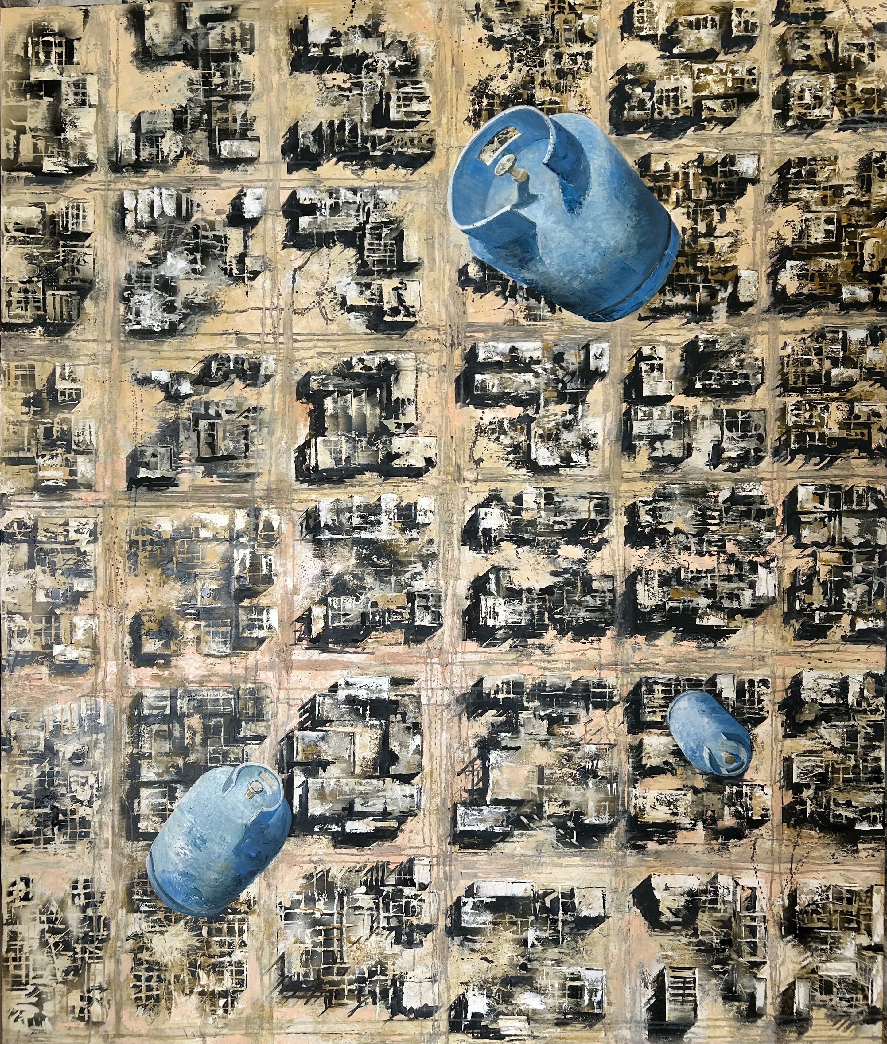 Before 2011, the 49-year-old says his artwork was abstract and experimental. When the revolution began, he started documenting what was happening through his oil paintings. They are stark and confronting. In one painting, blue barrel bombs dropped by Assad’s forces fall from the sky onto an already-demolished city – painted from the point of view of the helicopter, it feels as if you are falling down with them.