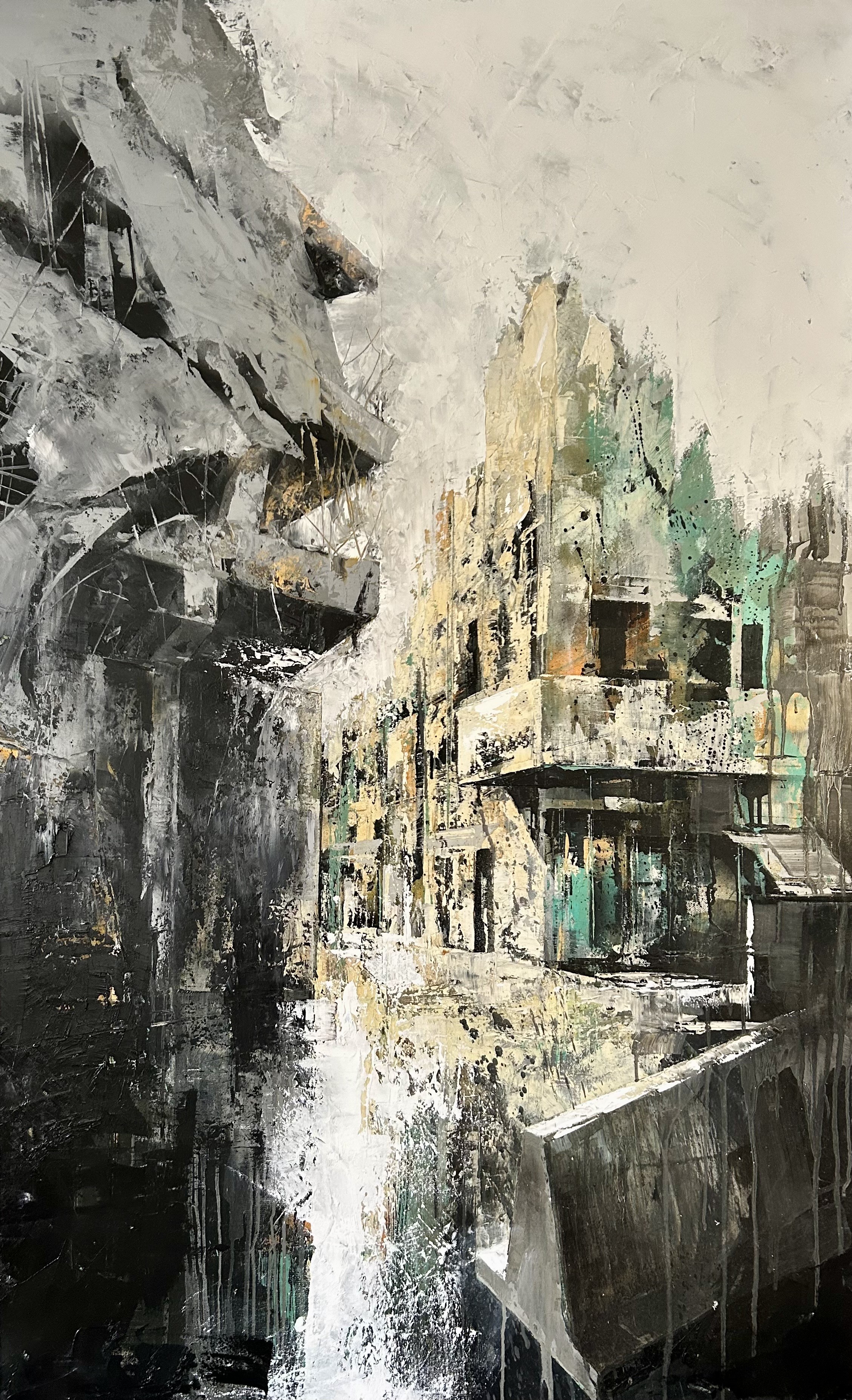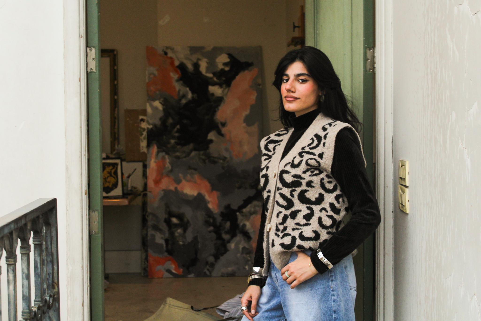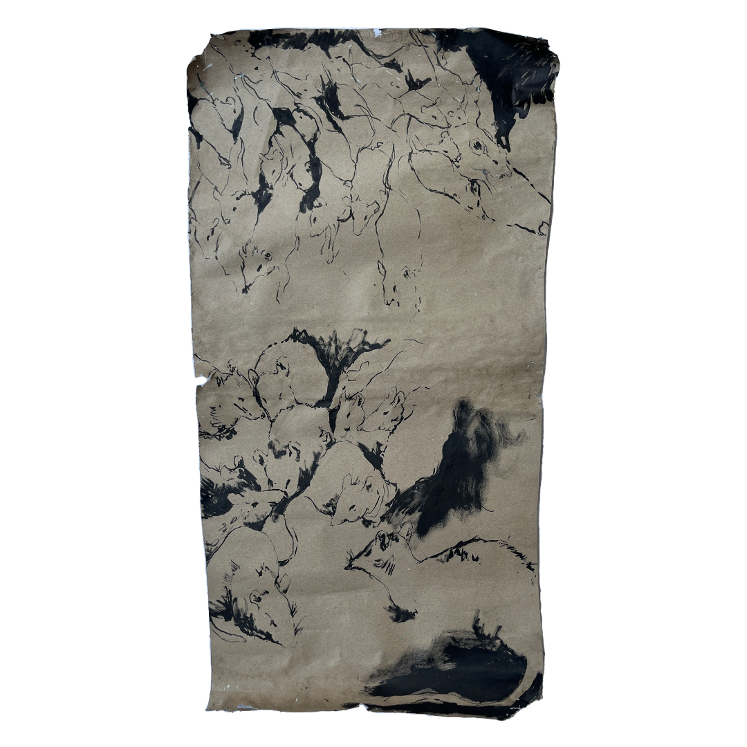 Jobar, a neighbourhood on the edge of Damascus that bears the scars of Assad’s heavy bombardment, was where artist Zainab Al Abrar used to live. Originally from Idlib in the northwest, she grew up in Jobar until one day during the war when she was 10, her mother told her to pack her things; they were leaving. Most days, the family sheltered in the basement. “I listened to the mice there,” says the 22-year-old. Those memories and the sounds feature prominently in her art, depicted through swirling oils and yellow acrylic mice scurrying across paper. “I feel we’re like mice. They are constantly escaping, running away. They’re terrified of what’s happening,” she says.