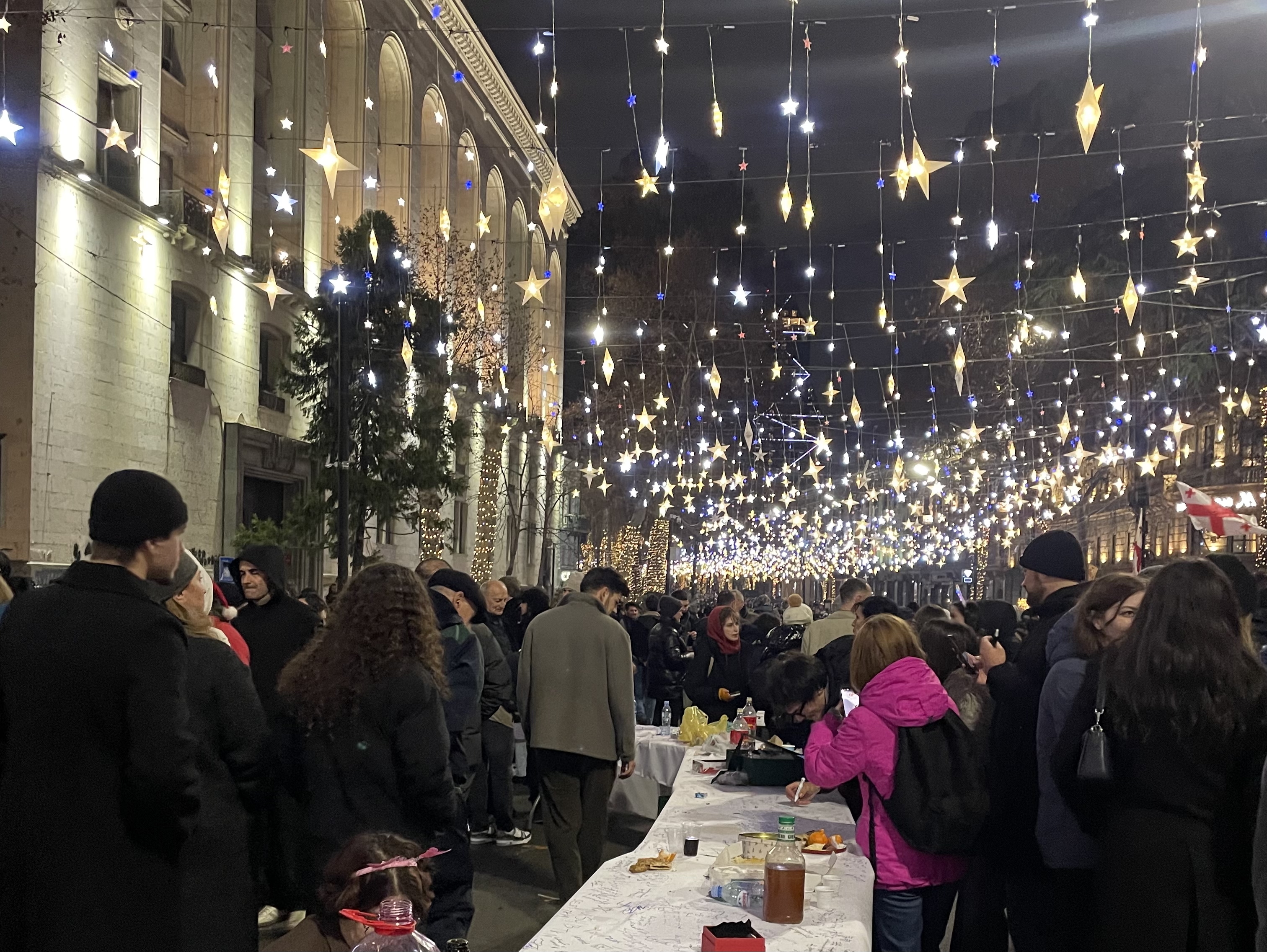 The impromptu display of vulgar defiance didn’t feel out of place. The entire party is in essence a continuation of a demonstration that had begun the evening of December 31 on Rustaveli Avenue. A twist on the traditionally family-focused “supra” – or ceremonial feast – it had served as a testament to Georgians’ gift for turning their rich cultural traditions into mesmerising acts of civil disobedience.