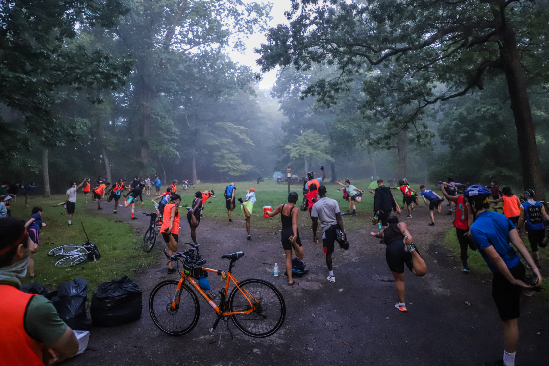 Around five AM, we awoke in darkness to eat yoghurt and granola, apply “butt butter” (chamois cream), and break camp. In a damp field, a blue-haired martial artist led the group through stretches.