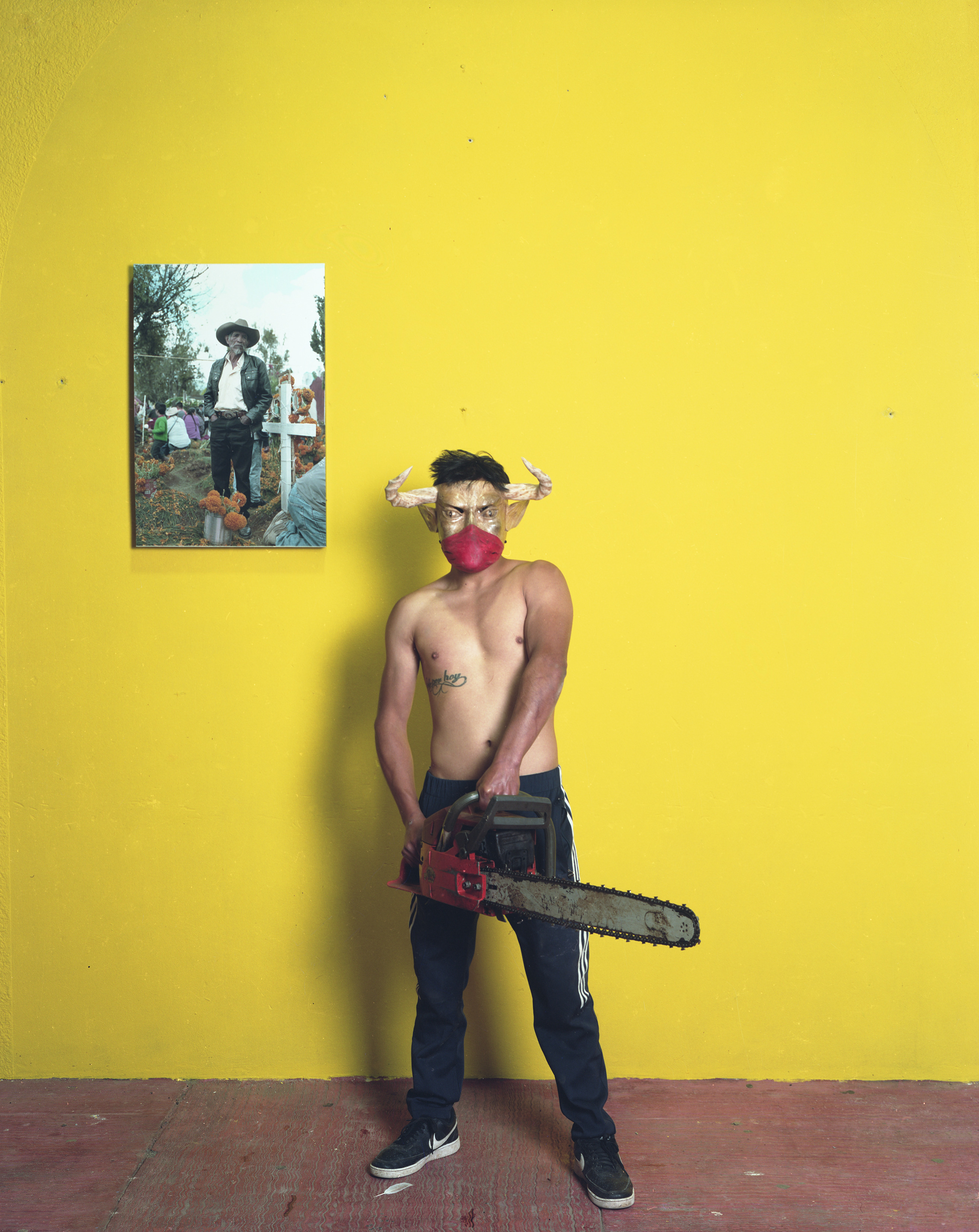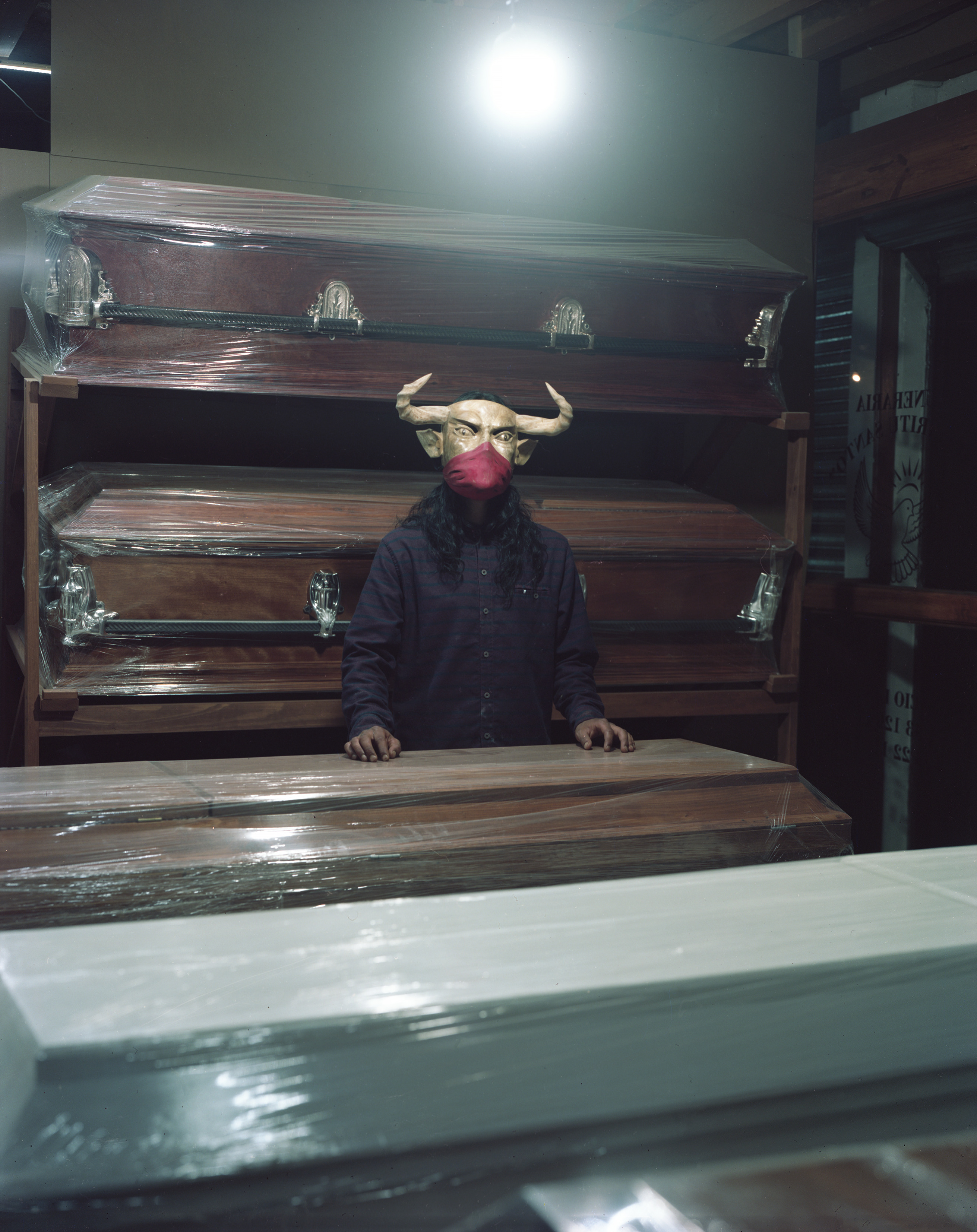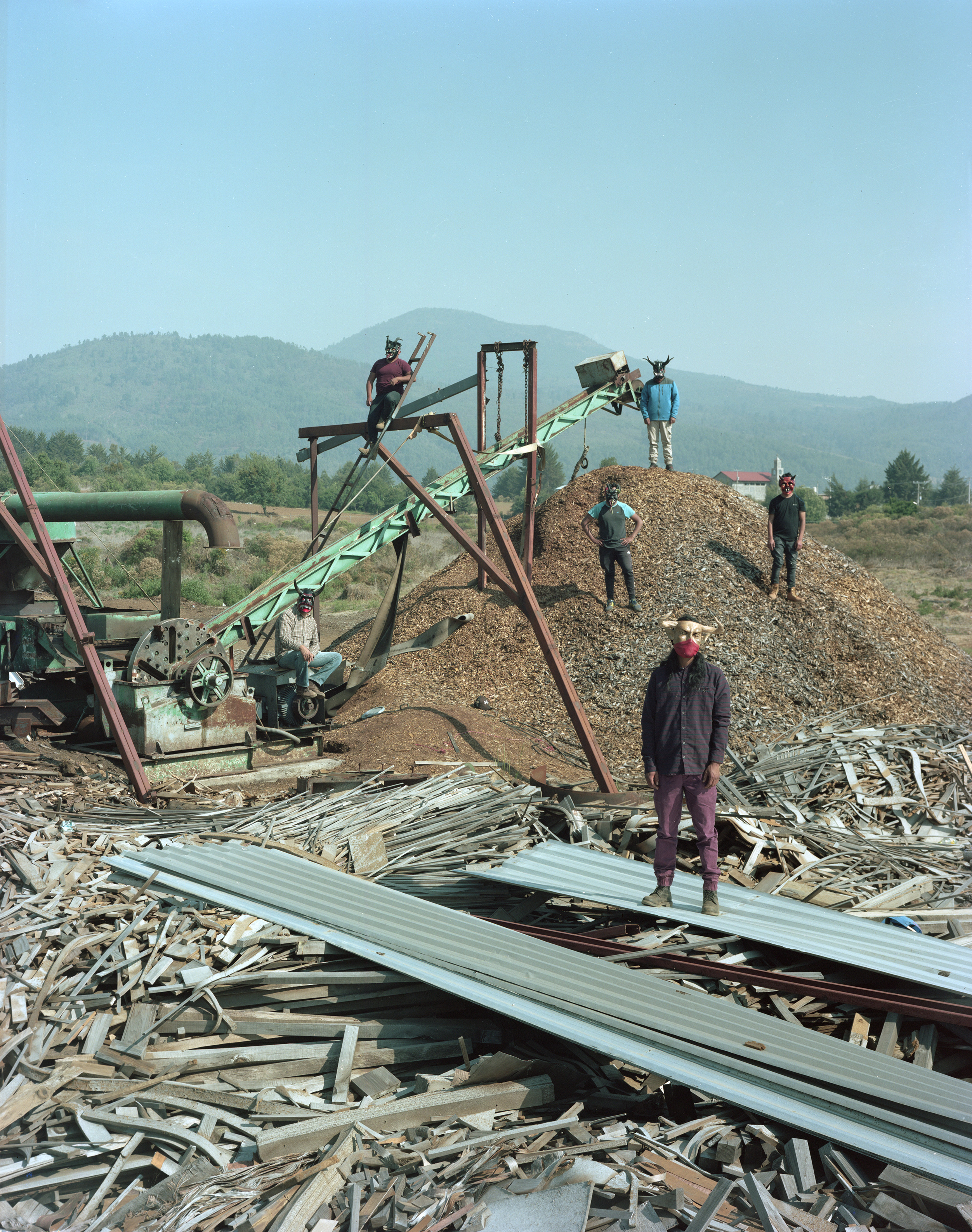 There are several more recurring motifs that crop up through the series. The masked narco lumberjacks, inspired by the horned devil, and a child with a wooden mask – which represents the struggle of the community. Many of these visual codes were developed in collaboration with Colectivo Cherani, a group of local artist-activists that make work in support of Indigenous rights.