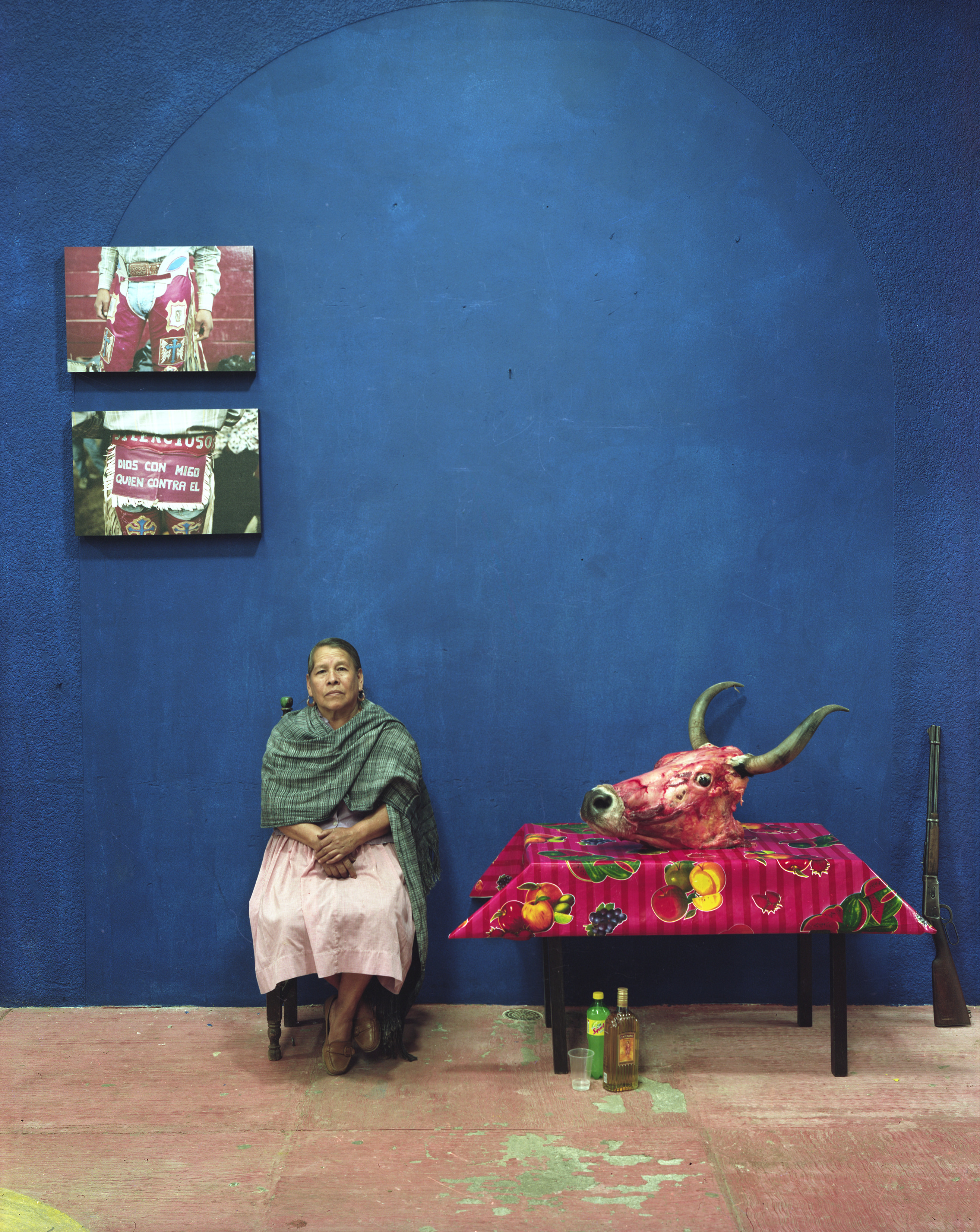 The image of the avocado crops up throughout Oro Verde, most obviously in its title, which means “green gold” in Spanish. We see this tattooed onto the head of a pig, in a typography often associated with cholos culture. This image was made in collaboration with a local tattoo artist in Cheran, as a nod to the violent history between the US and Mexico.