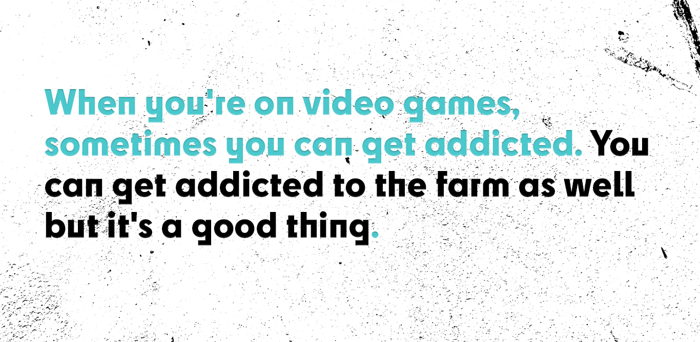 “When you’re on video games, sometimes you can get addicted. You can get addicted to the farm as well but it’s a good thing. It means you will have experienced farming and when you’re older and you can stop the environment from ending and stuff.”