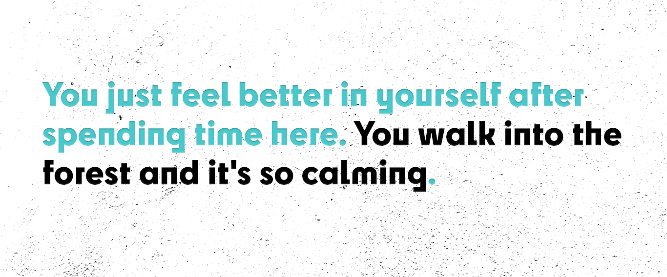 You just feel better in yourself after spending time here. You walk into the forest and it’s so calming. Before I started working here I was really introverted, I liked to be in my house, by myself in my room. When the pandemic started I’d look outside and realise how much I’d taken it for granted. It’s the same with the kids; they just want to run around and not be stuck inside all day. Some of them experienced a lot of anxiety, being here definitely helps them feel better.”