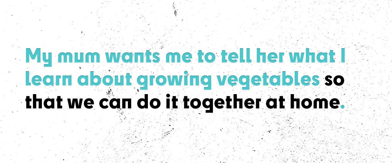 “My favourite thing is to grow tomatoes. You need to have a warm space where they can grow upwards. My mum wants me to tell her what I learn about growing vegetables so that we can do it together at home. I didn’t know anything about it before coming here.