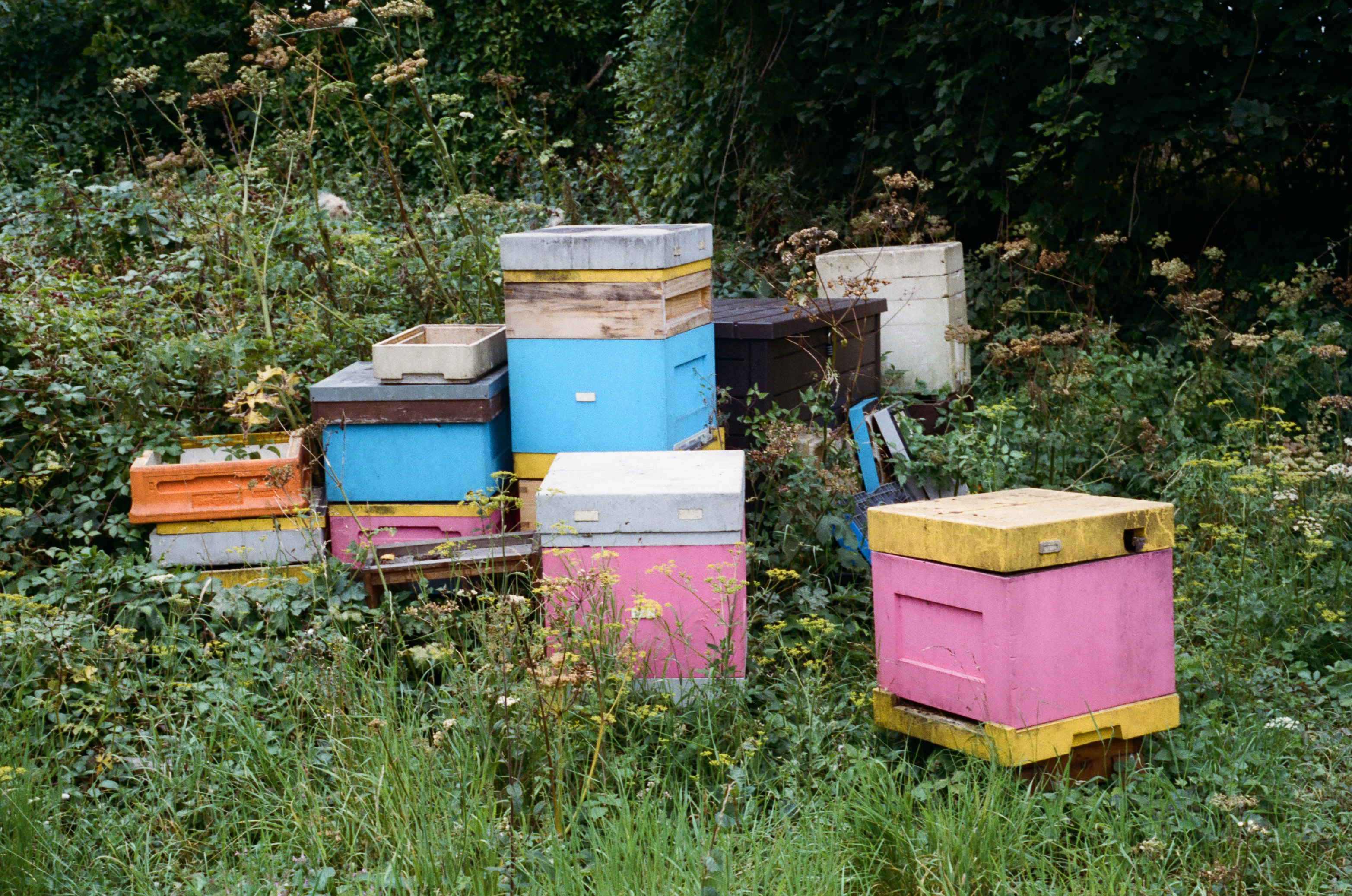 I visited the farm during its opening weekend in August, making my way from the local train station and past fields of sheep munching on apples. The farm itself feels like a slice of rural paradise, with its mature trees, rescued chickens scratching in the dirt for bugs, vegetable patches and of course the brightly coloured bee hives.