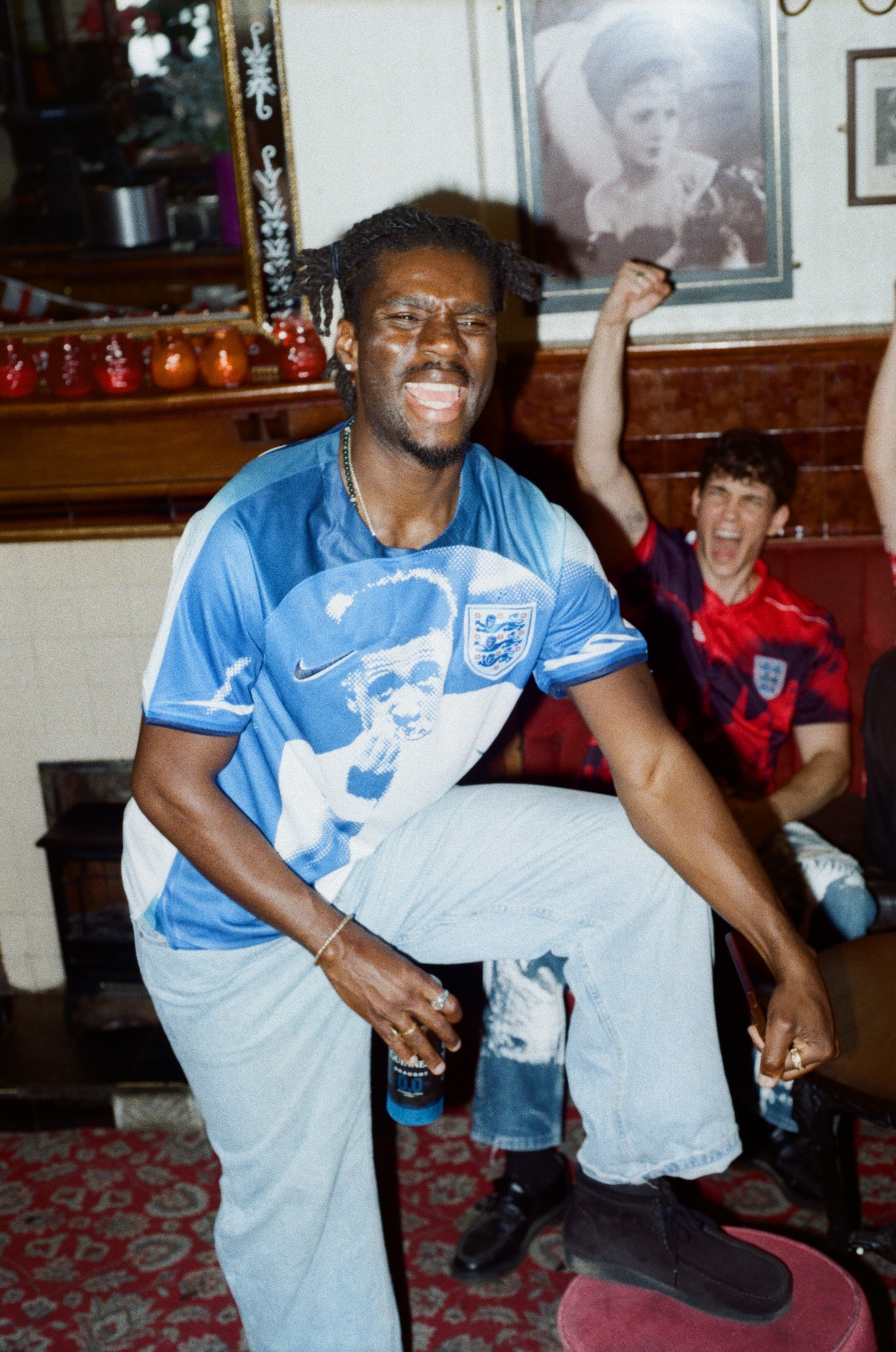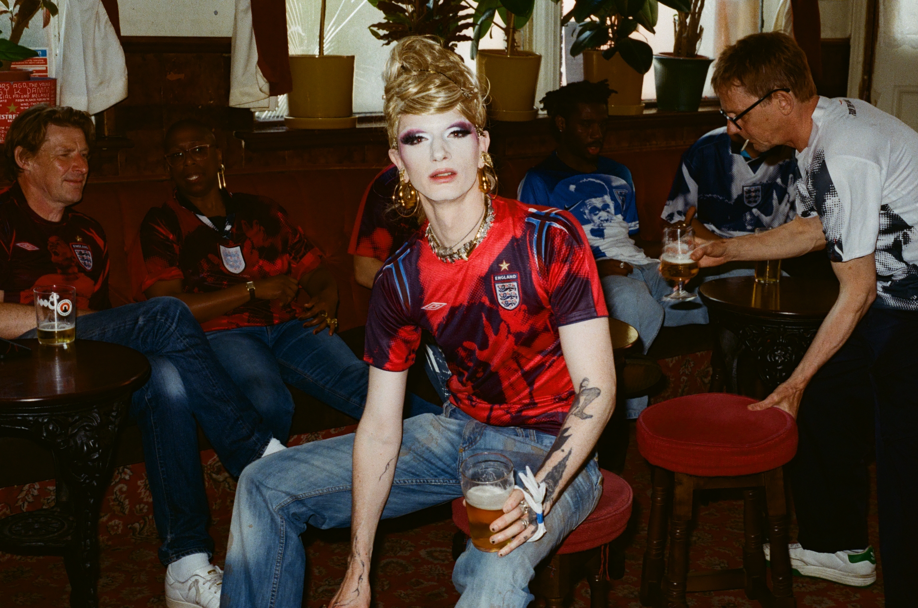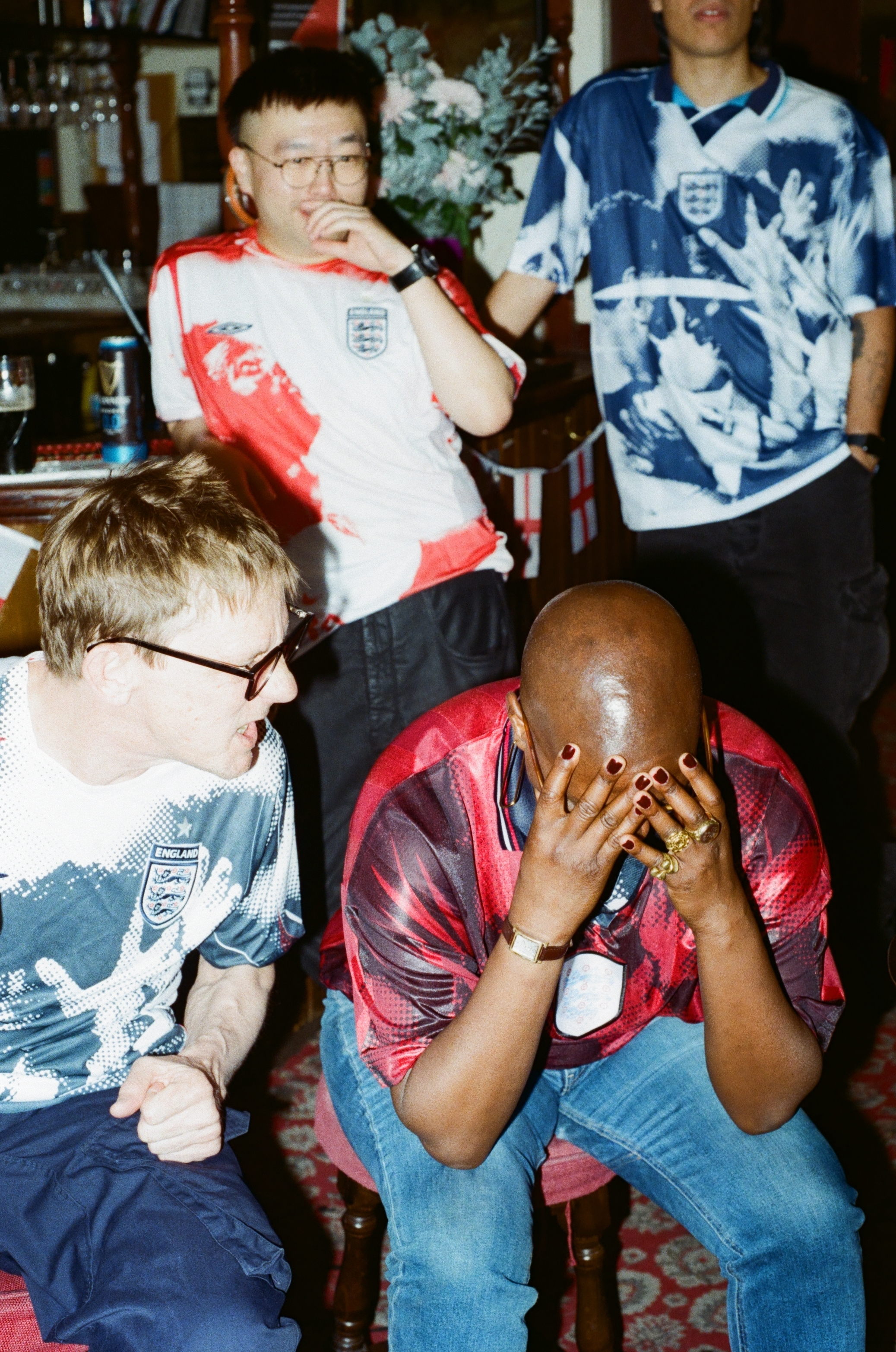 To bring the project together, Crowther enlisted photographer Rebecca Zephyr Thomas to take pictures of models in a Soho pub, who shares a similar outlook. “I watched the final as well, and it was obviously 2021 so a lot of things had gone on in the past year,” Thomas says. “But one thing was Marcus Rashford saving children with free meals, so even if you weren’t a mega football supporter, he was basically the most beloved person in the country for looking after children when the government wouldn’t. Also, Black Lives Matter came out massively that year and there was this backlash, but I think there is always backlash with liberal progress.”