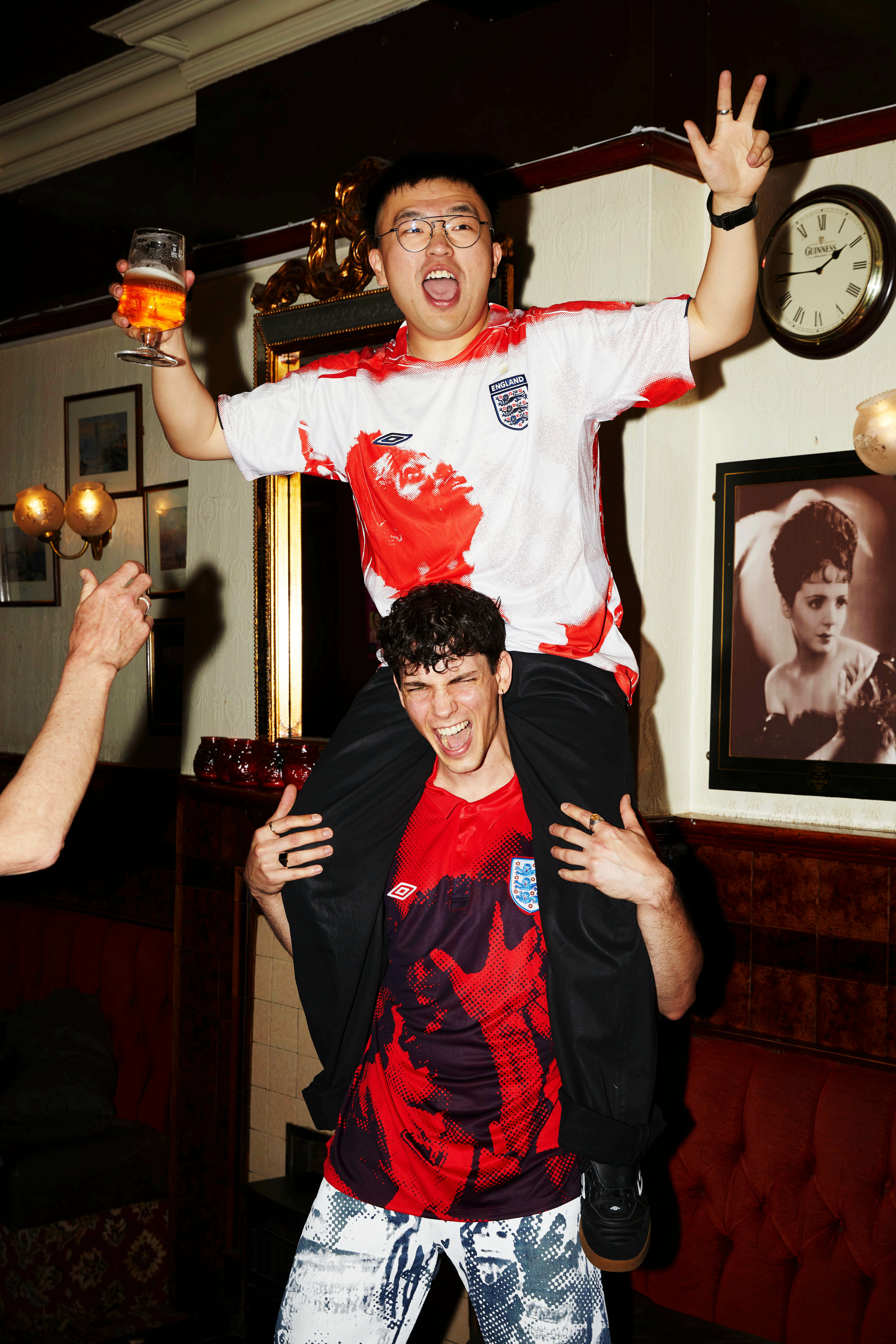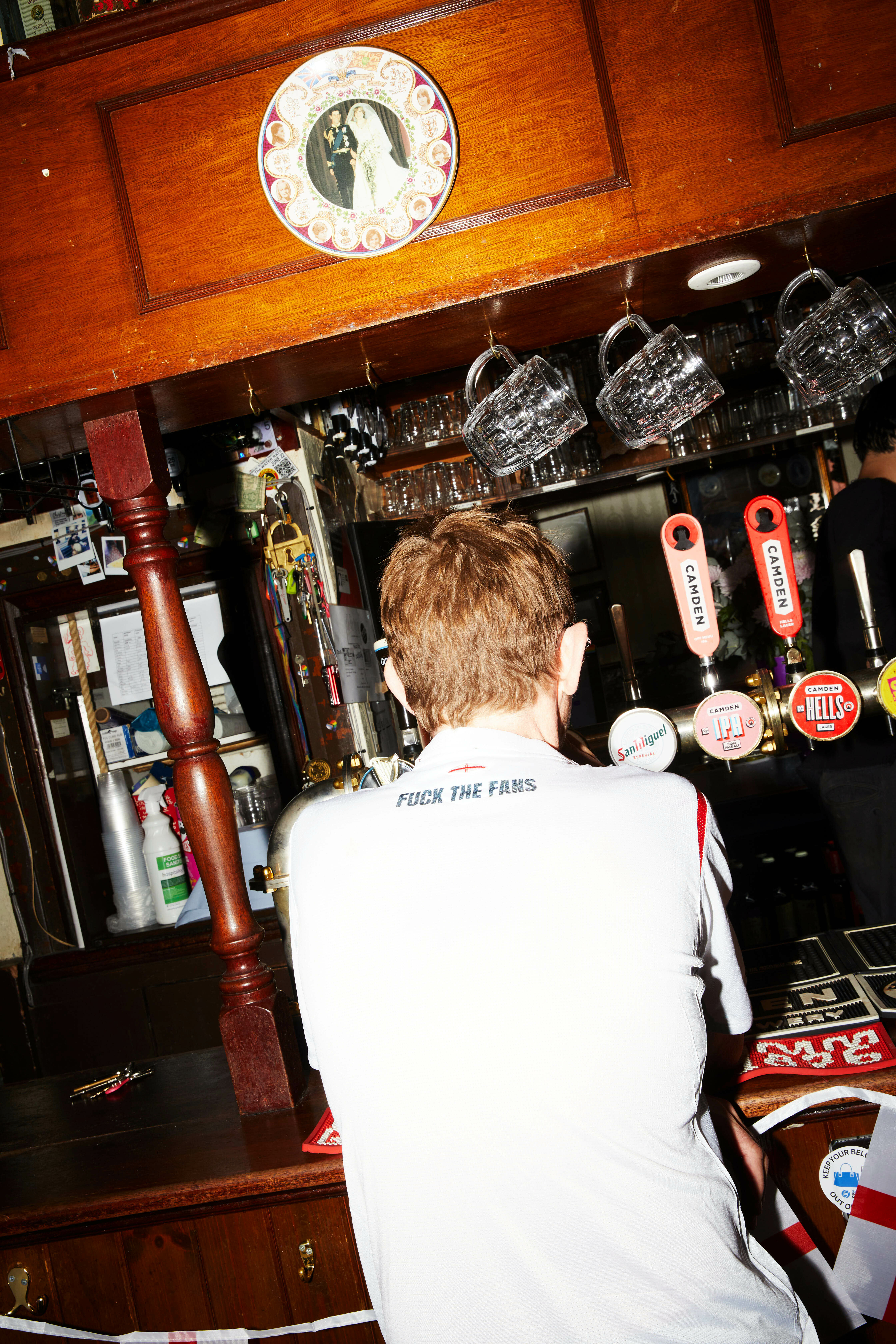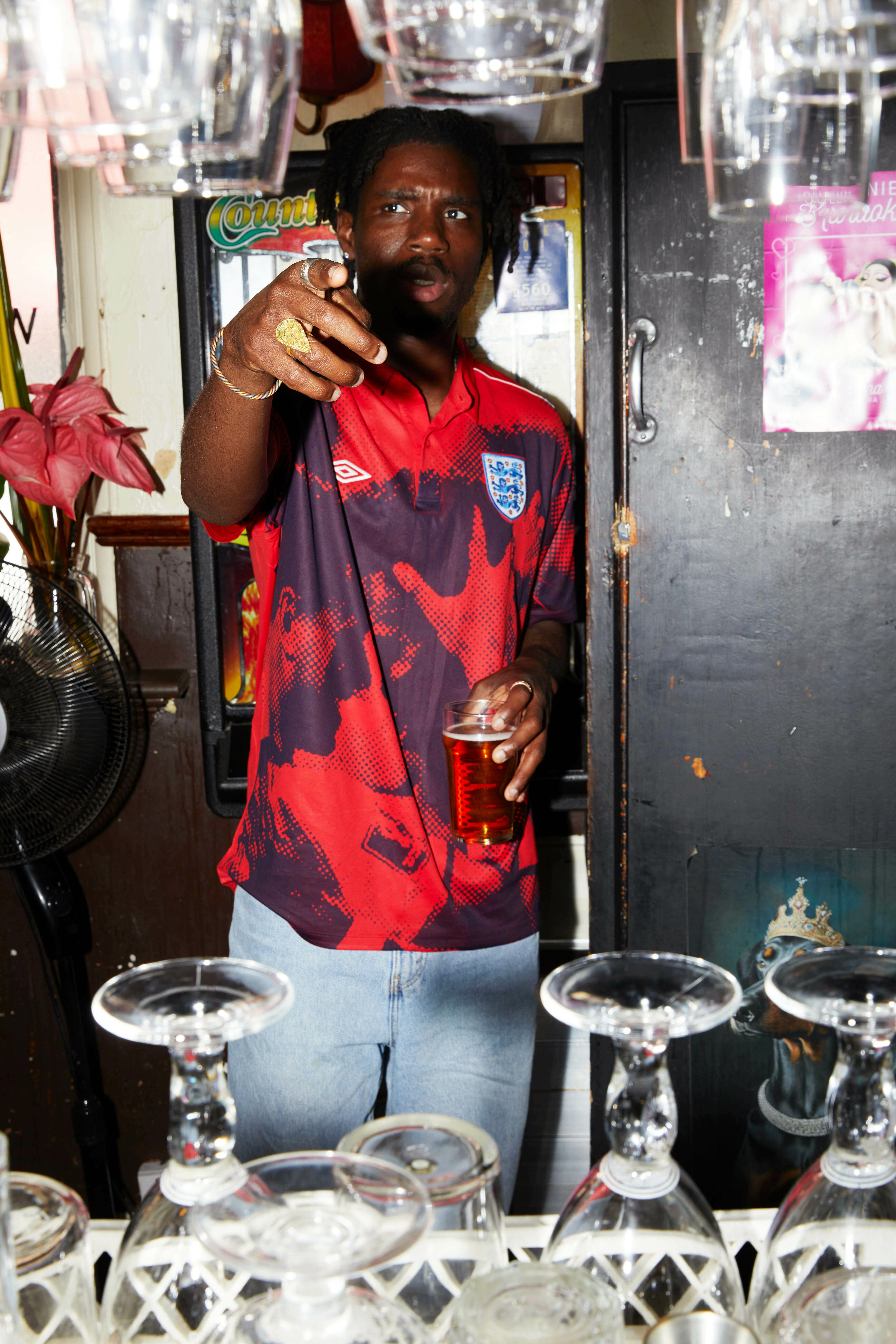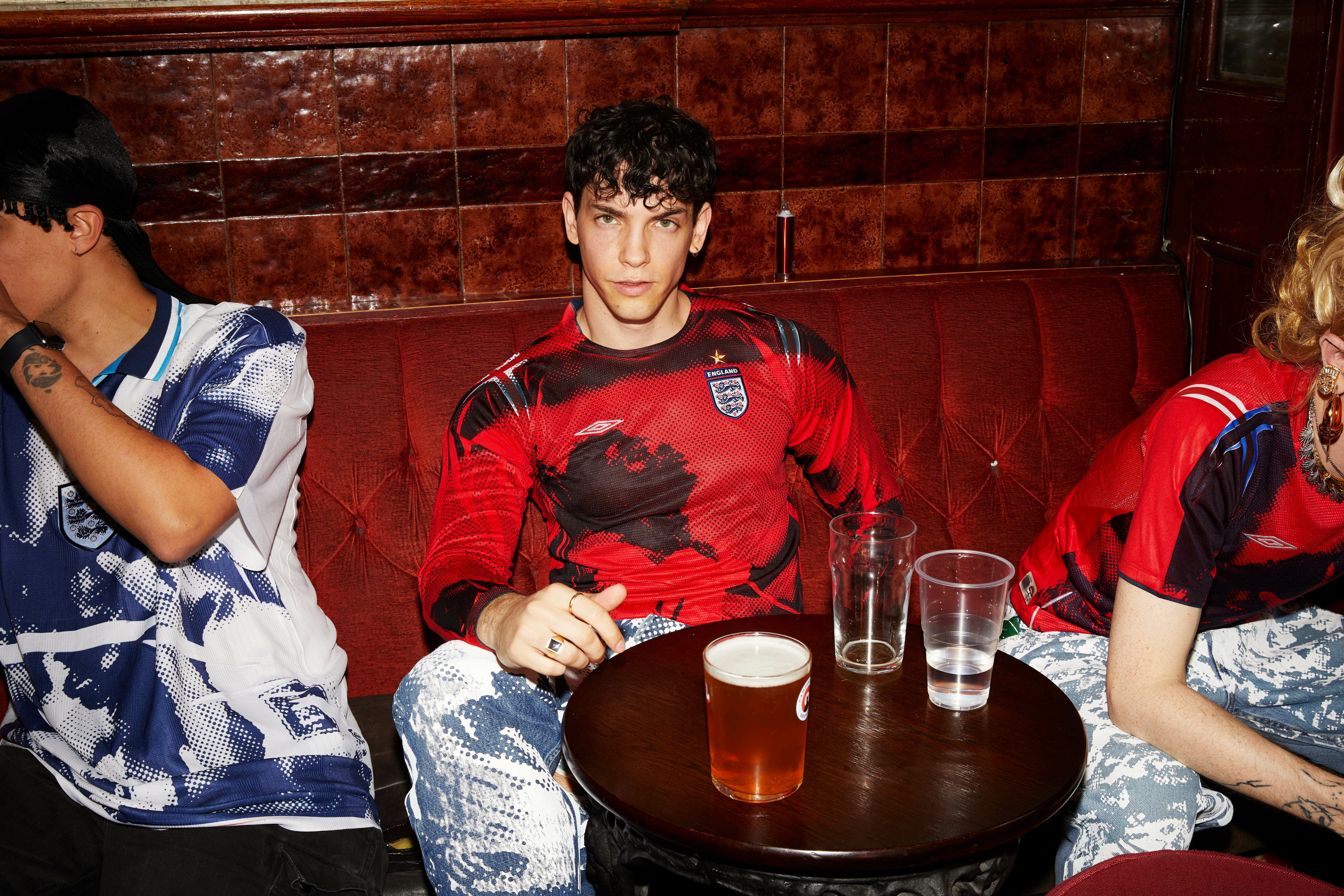 To bring the project together, Crowther enlisted photographer Rebecca Zephyr Thomas to take pictures of models in a Soho pub, who shares a similar outlook. “I watched the final as well, and it was obviously 2021 so a lot of things had gone on in the past year,” Thomas says. “But one thing was Marcus Rashford saving children with free meals, so even if you weren’t a mega football supporter, he was basically the most beloved person in the country for looking after children when the government wouldn’t. Also, Black Lives Matter came out massively that year and there was this backlash, but I think there is always backlash with liberal progress.”