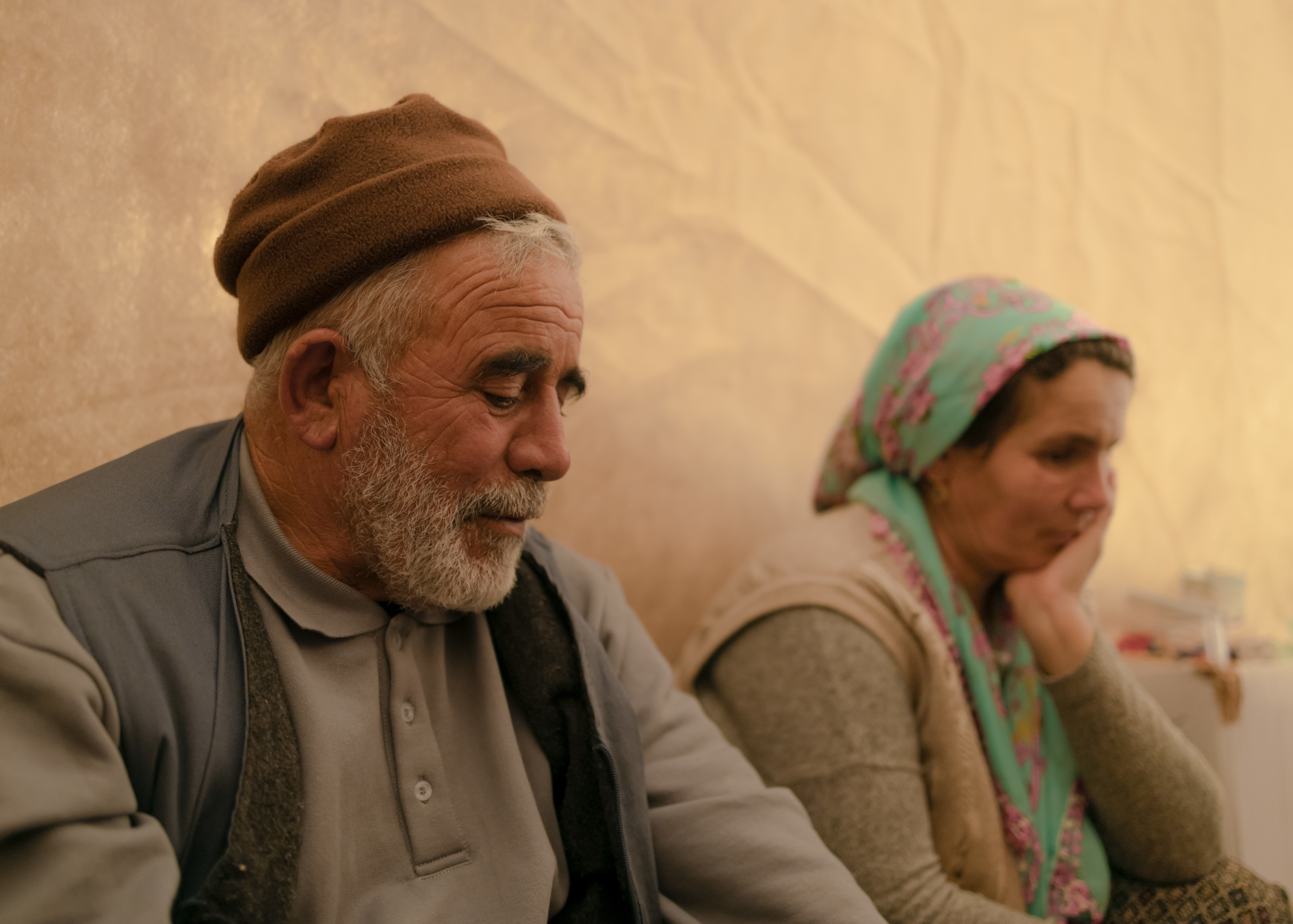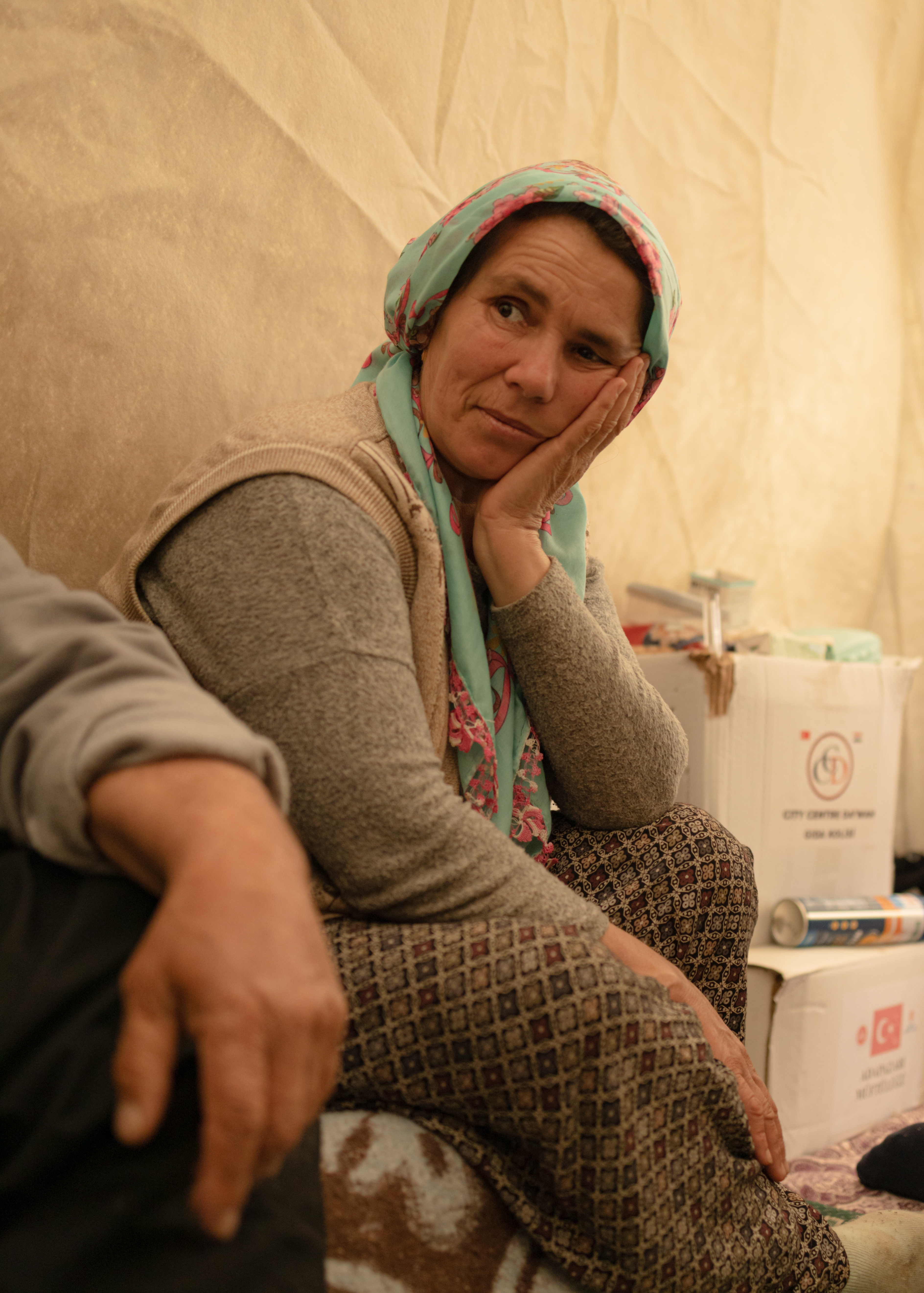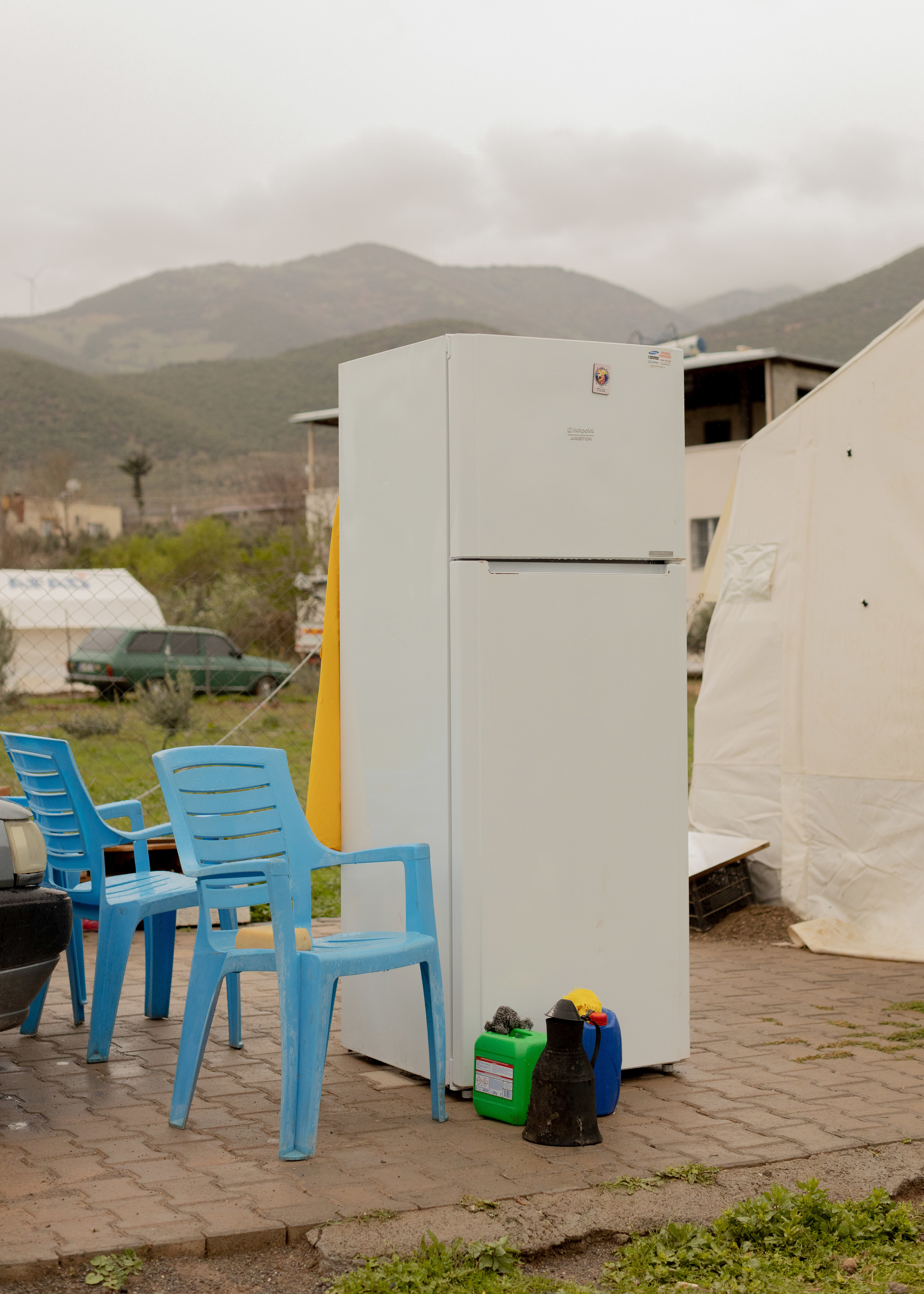 Roads were inaccessible for days before rescue teams could reach the land of farmers where Dordu and Şerife live. The couple is now afraid to enter their damaged house, where shattered glass on the kitchen floor remains untouched. Their new accommodation is a warm tent carefully tied up, where a small sofa recovered from the damaged house helps to resembles a feeling of home. What does not fit inside – a fridge, some big pans and kitchen items – is placed outside just next to their car. Dordu has been travelling in cities around Turkiye for 15 years, working in tunnel construction fields and saving six months of the year to cultivate the land with his wife and sons.