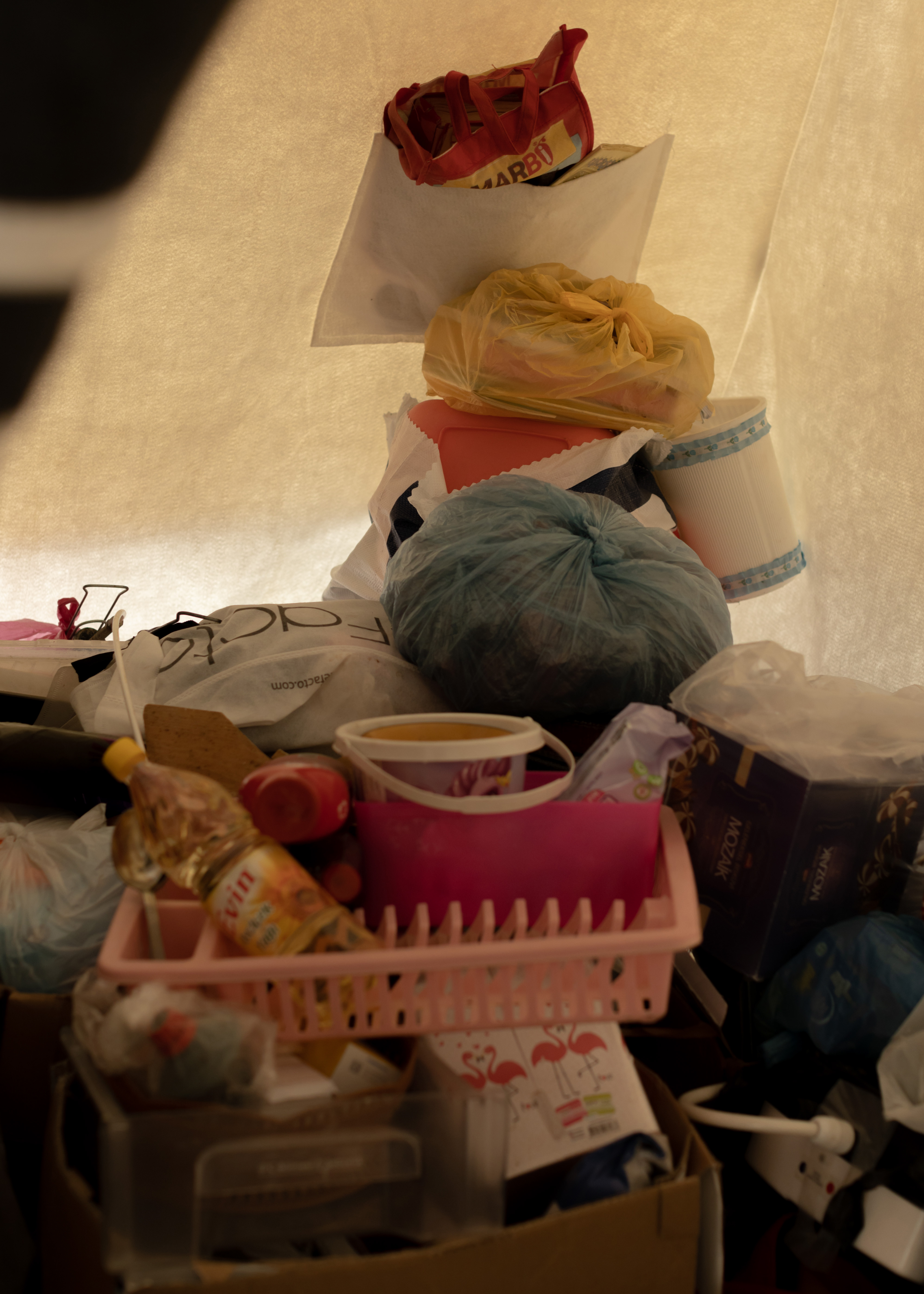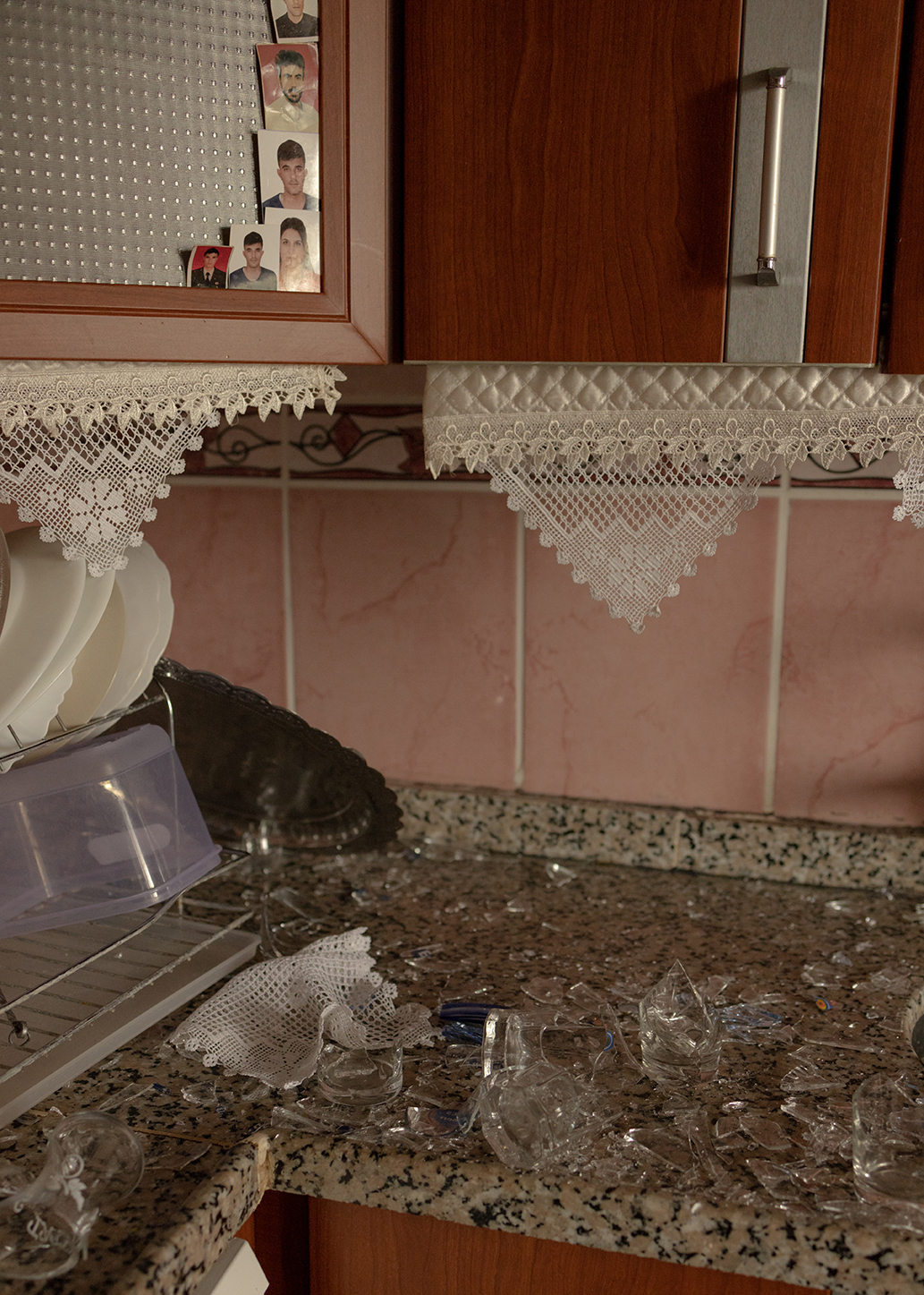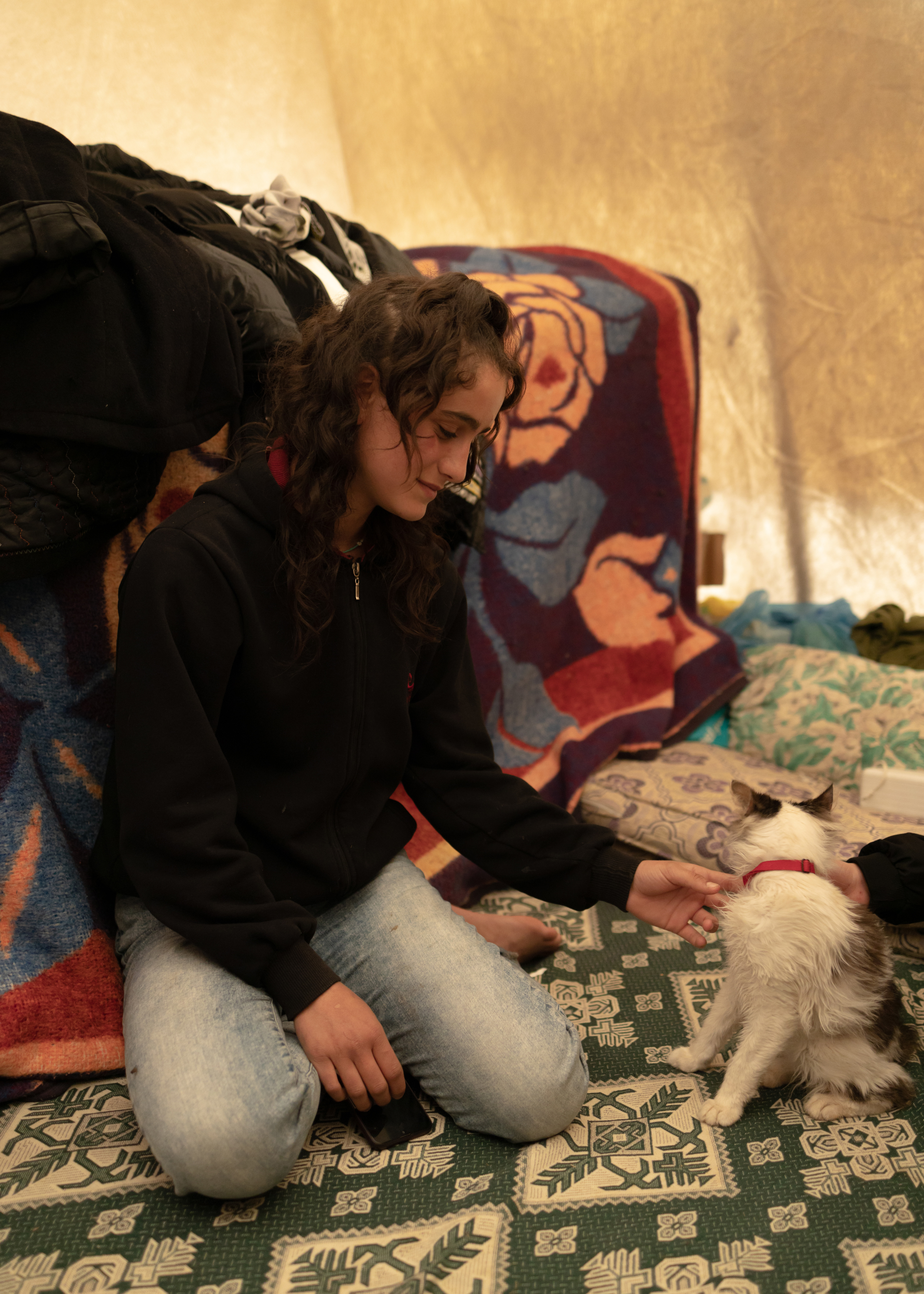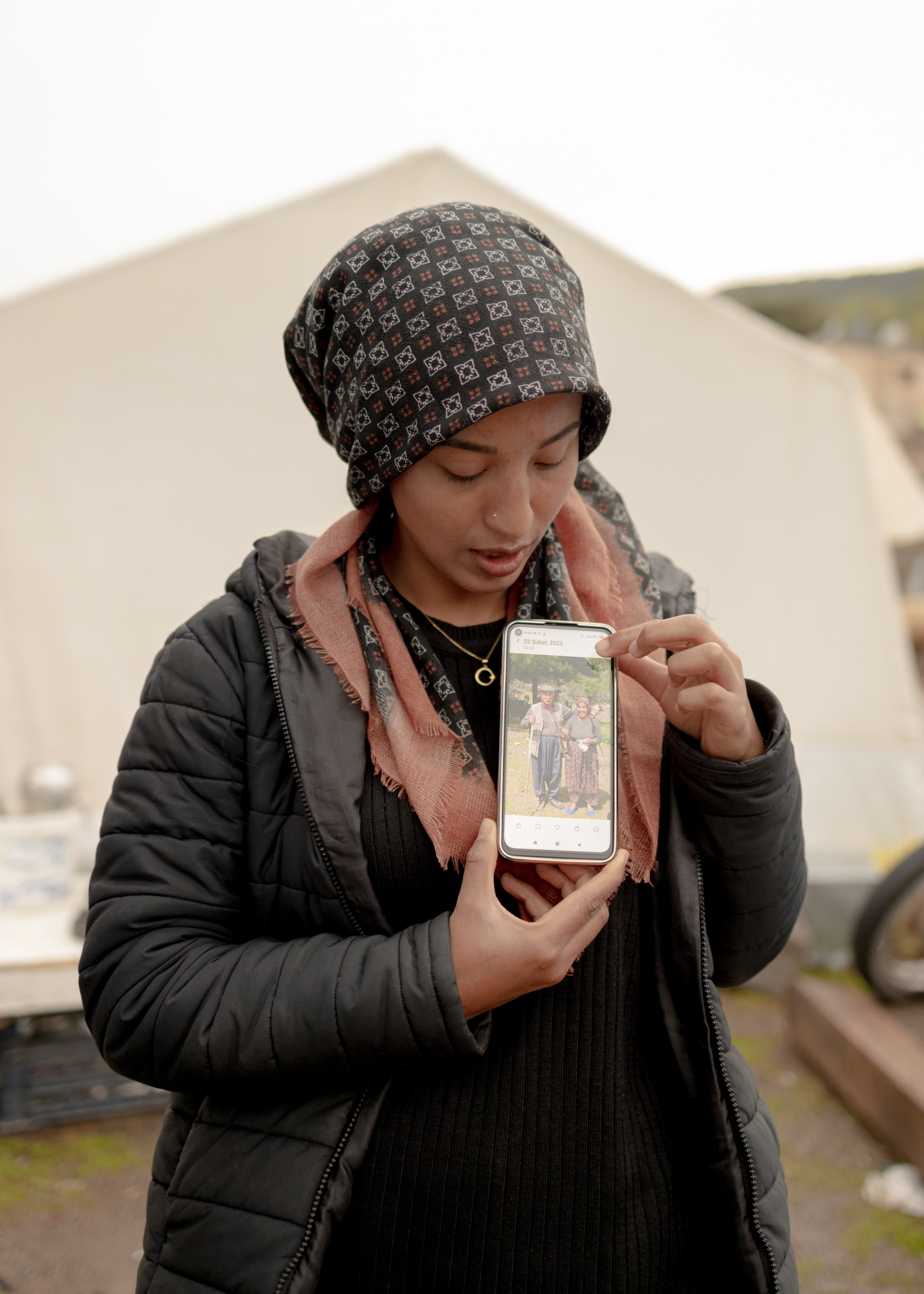 Roads were inaccessible for days before rescue teams could reach the land of farmers where Dordu and Şerife live. The couple is now afraid to enter their damaged house, where shattered glass on the kitchen floor remains untouched. Their new accommodation is a warm tent carefully tied up, where a small sofa recovered from the damaged house helps to resembles a feeling of home. What does not fit inside – a fridge, some big pans and kitchen items – is placed outside just next to their car. Dordu has been travelling in cities around Turkiye for 15 years, working in tunnel construction fields and saving six months of the year to cultivate the land with his wife and sons.
