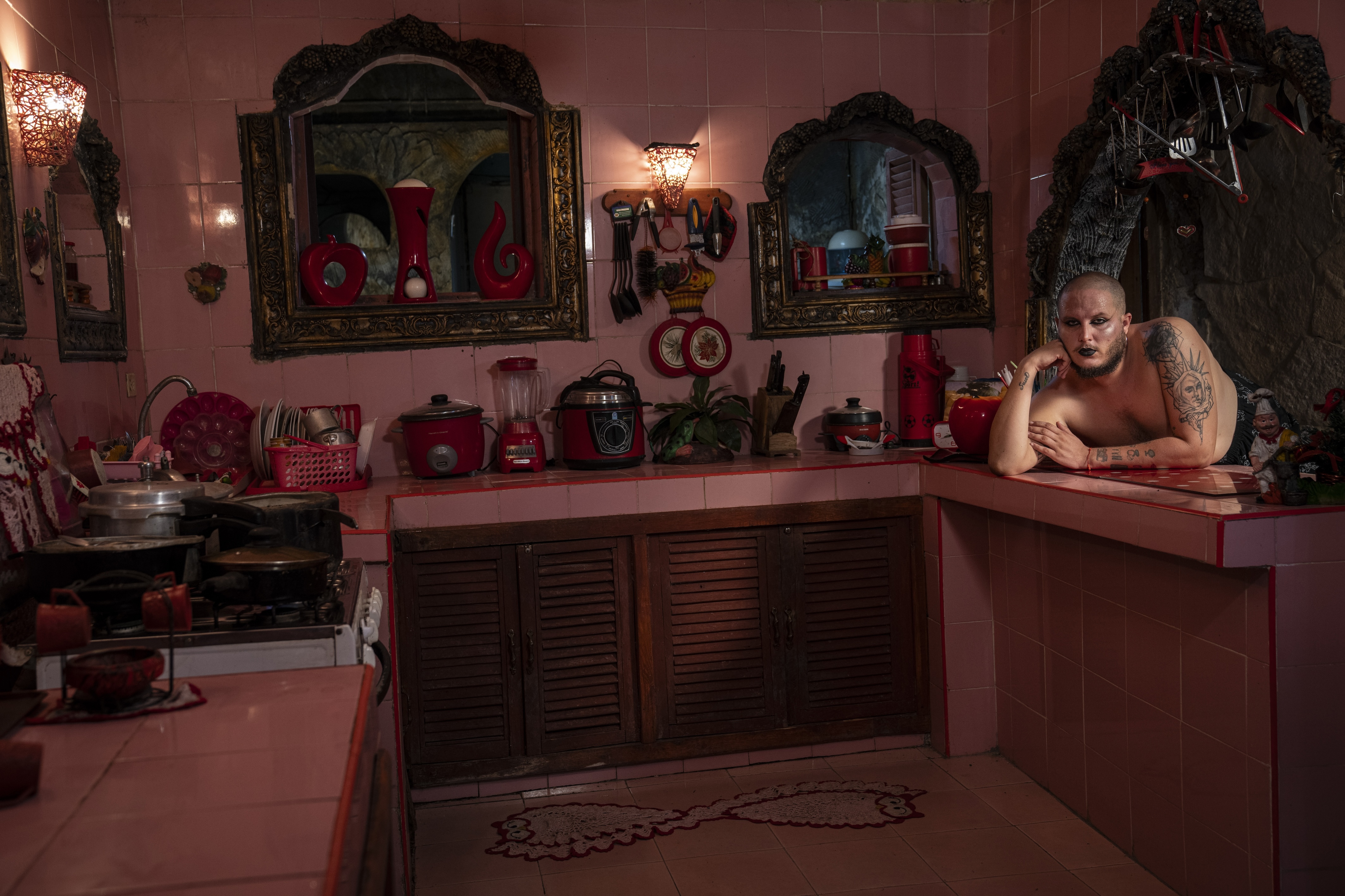 Bouchard’s portraits give an insight to those styles, with young Cubans photographed within their homes or in private spaces – in often lavish outfits, rocking confident hairstyles, and challenging traditional barriers of gender conformity – with the country’s unique architecture and visual style forming a dramatic backdrop. “I wanted the images to be a reflection of how they represent themselves on Instagram,” he explains. “So I let them dictate how they would dress, how they would stand, etc.”