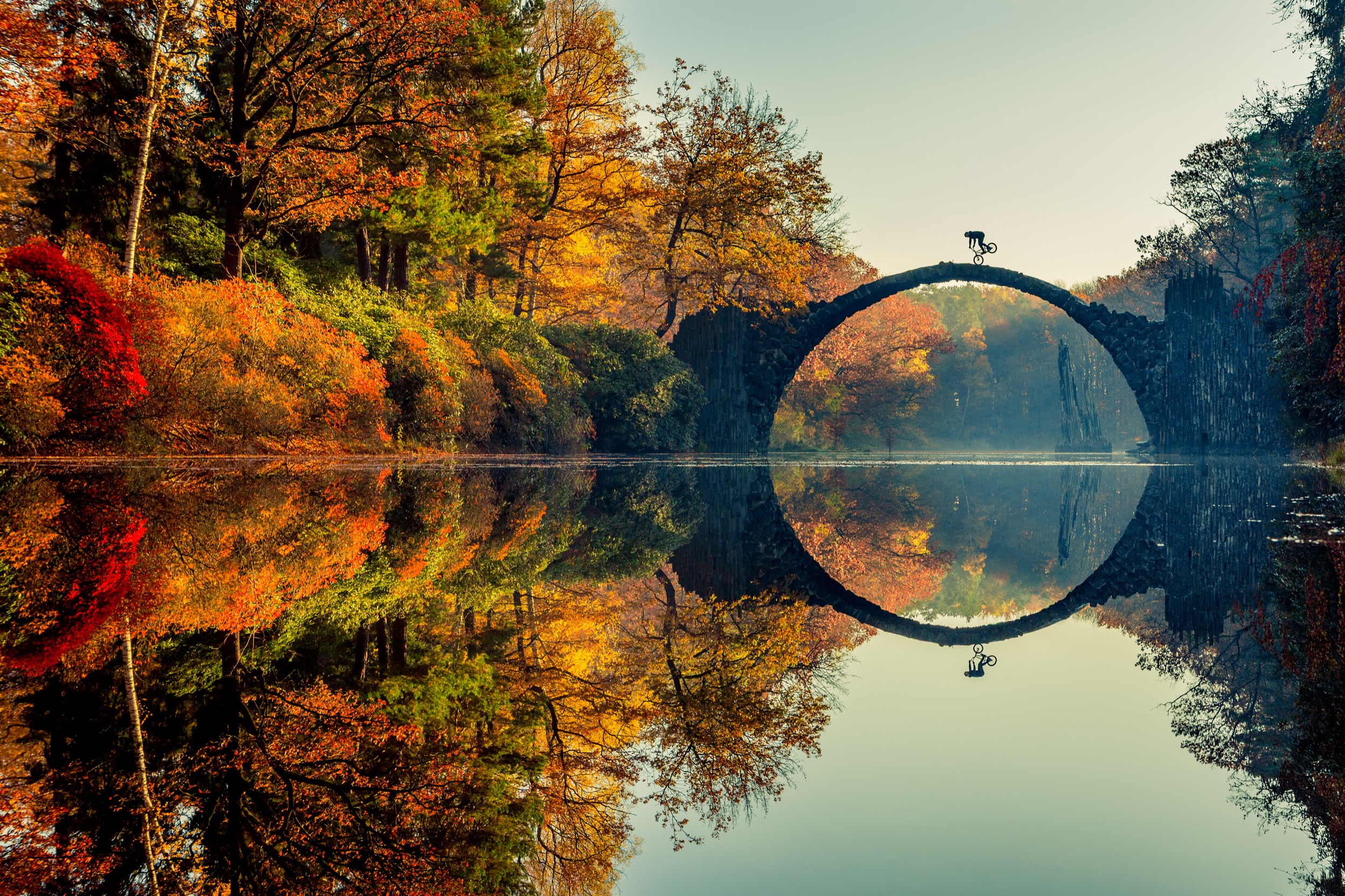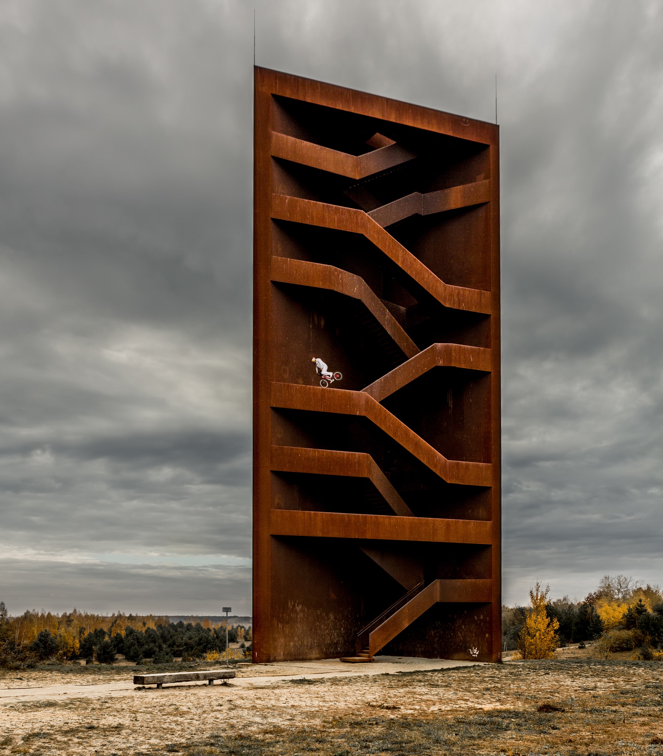 German BMX pro Senad Grosic is in perfect balance. With his front wheel anchored to the old stone bridge in Gablenz, his rear wheel and body pokes up into the air like a ballerina. His likeness is captured in the mirror-like surface of the water metres below, creating a reflection that’s almost too perfect to believe.