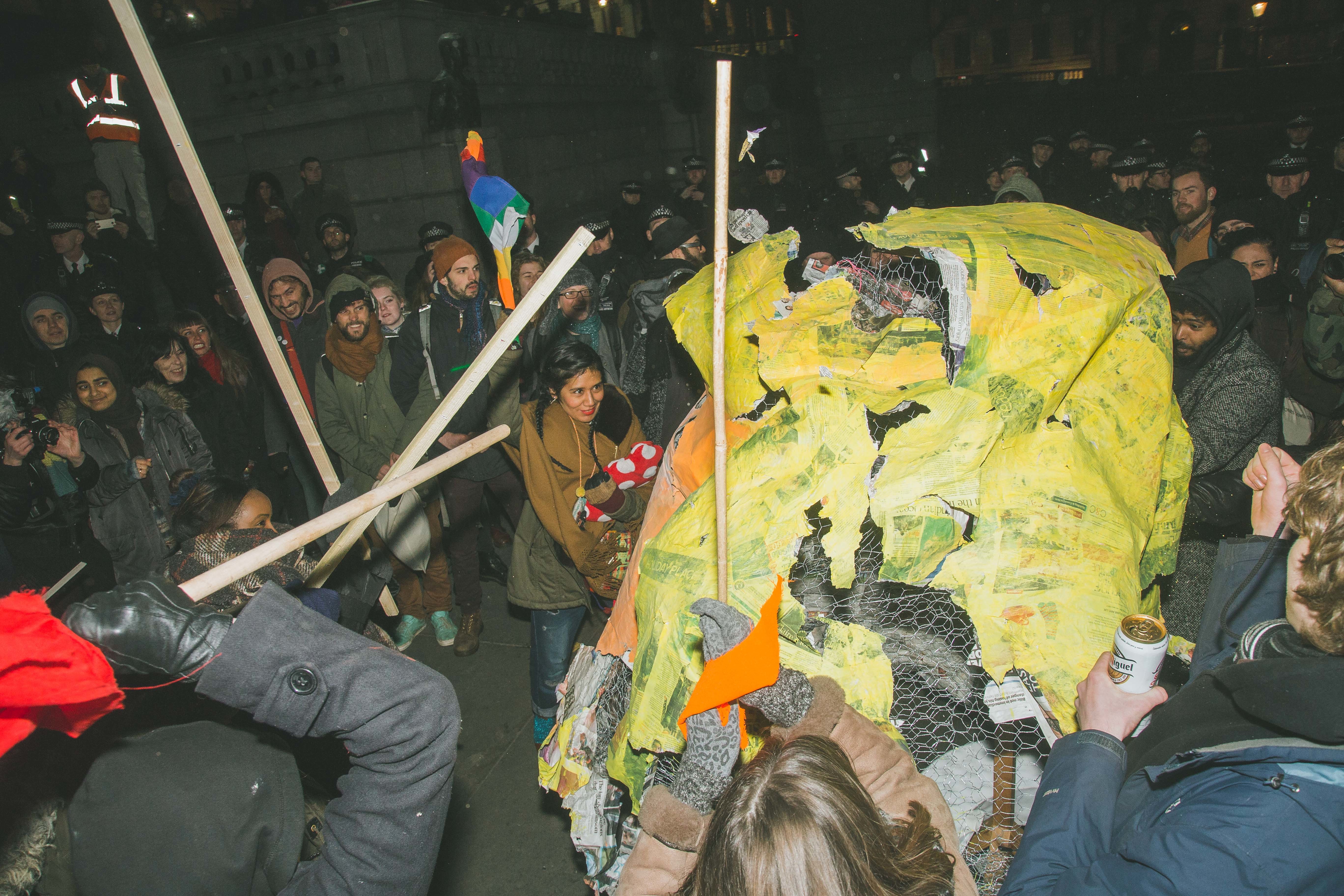 'Trump's a wasteman' — Protestors and police clashed in central London last night as anti-Trump protests kicked off in the city, with a giant Trump head effigy being beaten to a pulp.