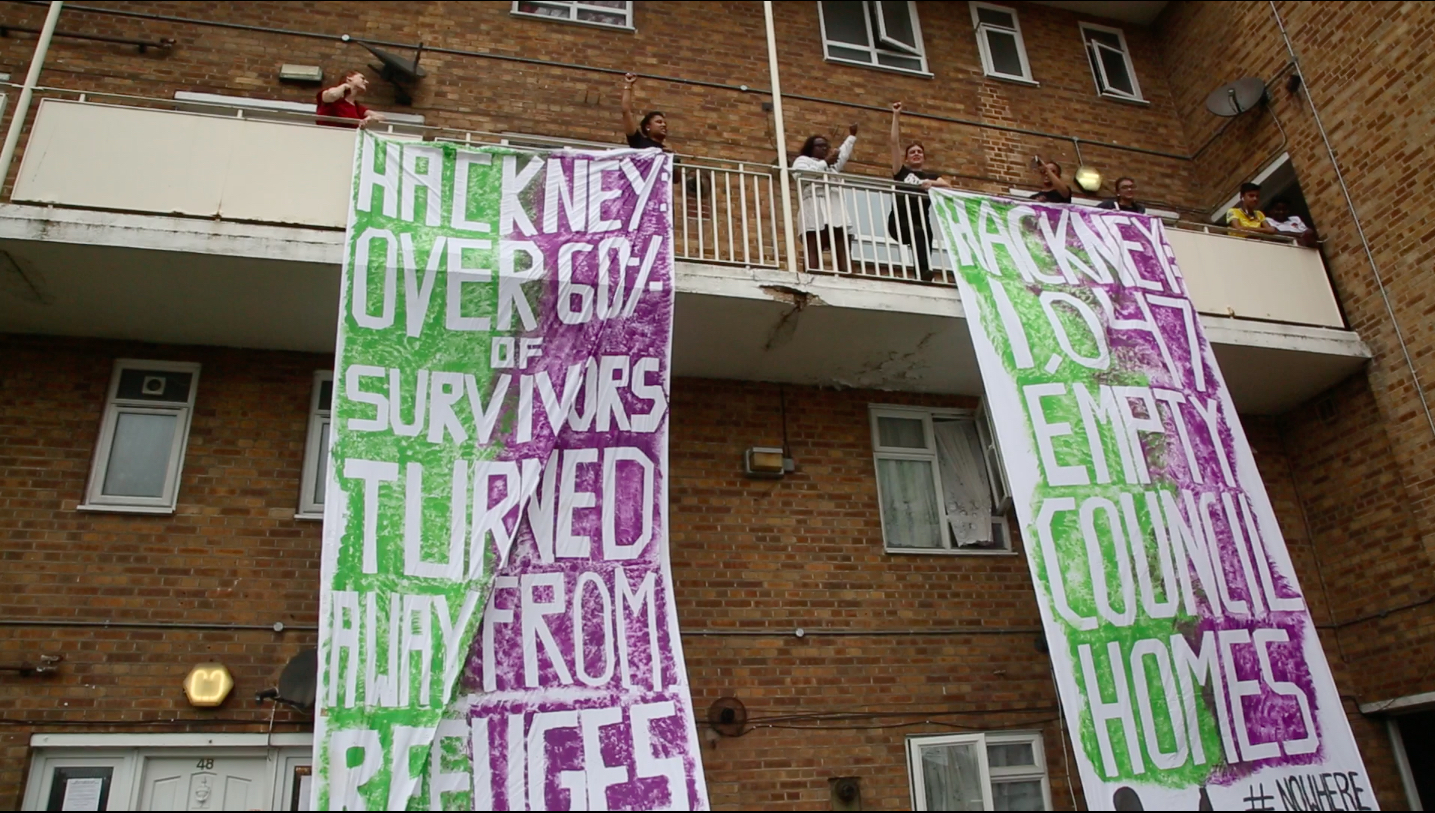 Homes free from violence — Campaigners from feminist direct action group Sisters Uncut took to the streets of London today, before occupying one of Hackney's 1047 empty council homes to highlight the need for places of refuge for survivors of domestic violence. They say they won't leave until their demands are met.