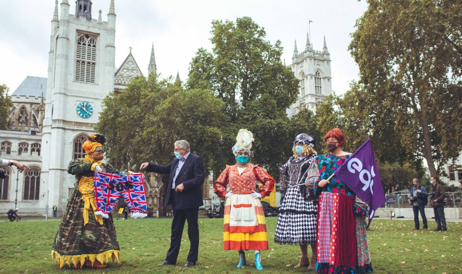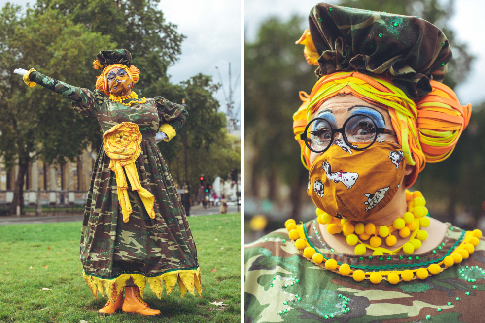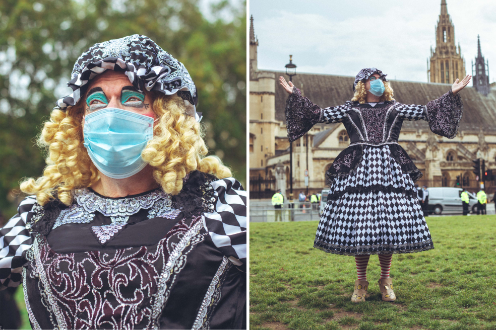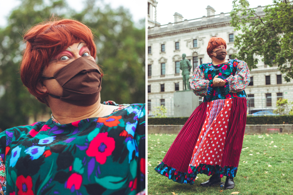 The first thing you could hear was the music, drifting above the heavy din of traffic on Whitehall. Next, the flags came into view, making their way down the thoroughfare, fluttering in the early autumn breeze. As the protest came into view, restricted to the pavements by the police, half a dozen brightly coloured, amorphous blobs soon became recognisable as pantomime dames, leading a procession of around 120 people down the street.